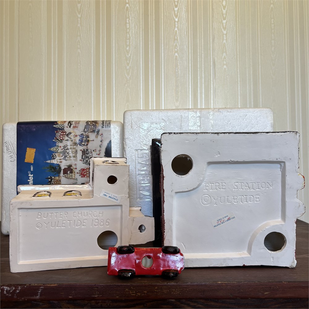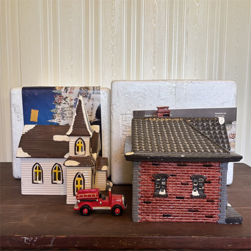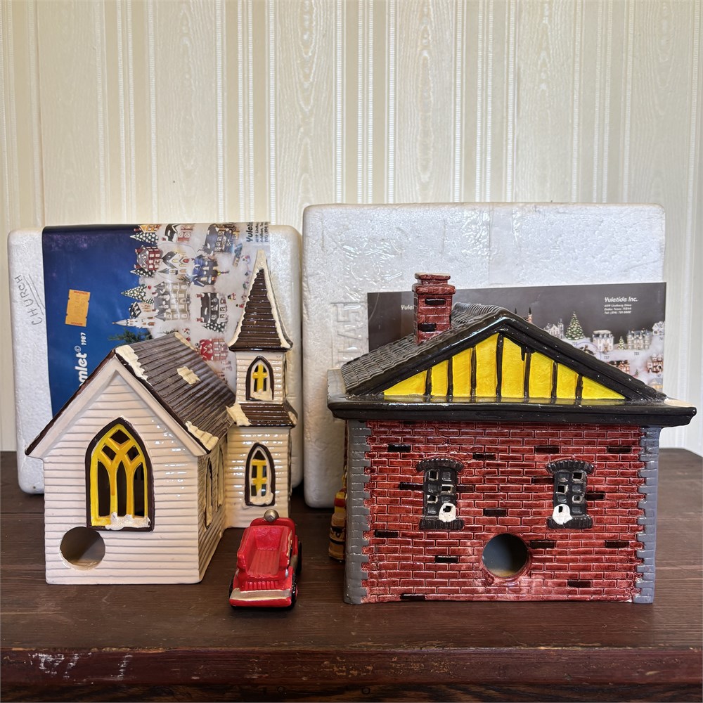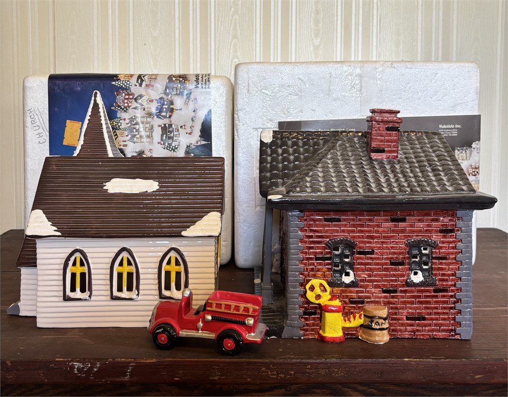 Vintage Yuletide Village Ceramic Fire Station and Butter Church Buildings