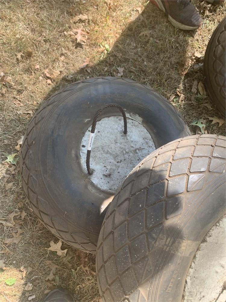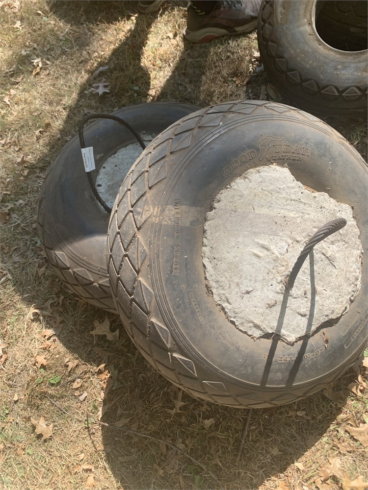 Each tire has a concrete core with a metal hook - they may have been used as tire swings.