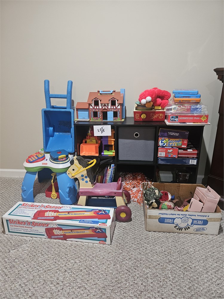 Mixed Toy Lot- Wood shelf, Bowling game, Elmo, Fisher Price, Books & More