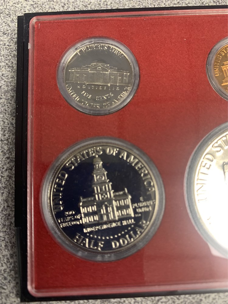 Features the Kennedy half dollar, an Eisenhower dollar, and a Washington quarter, all with the Bicentennial design, as well as a Roosevelt dime, a Jefferson nickel, and a Lincoln cent.