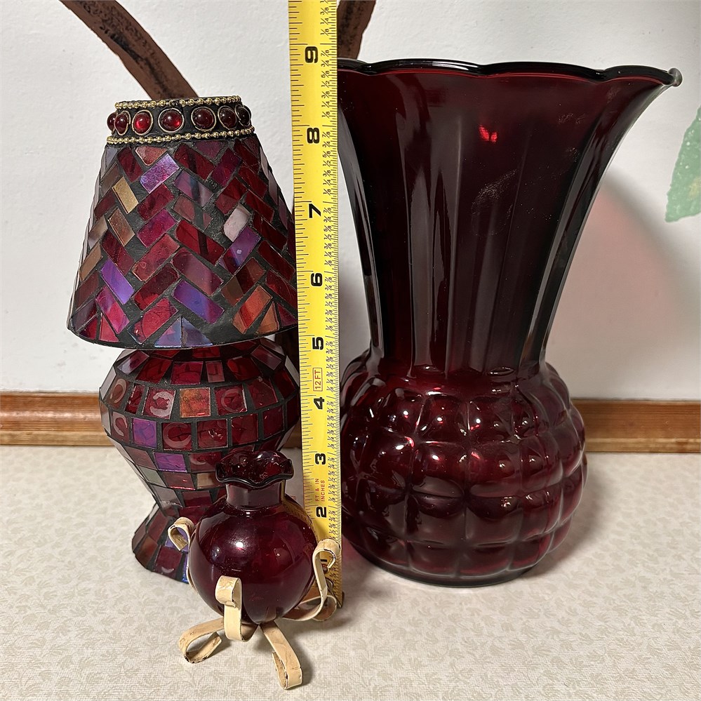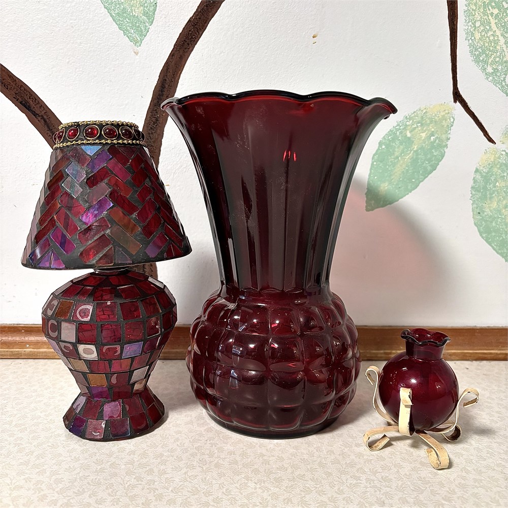 Decorative Red Glass Bundle w/ Candle Lamp and Large Vase (8.75"T)