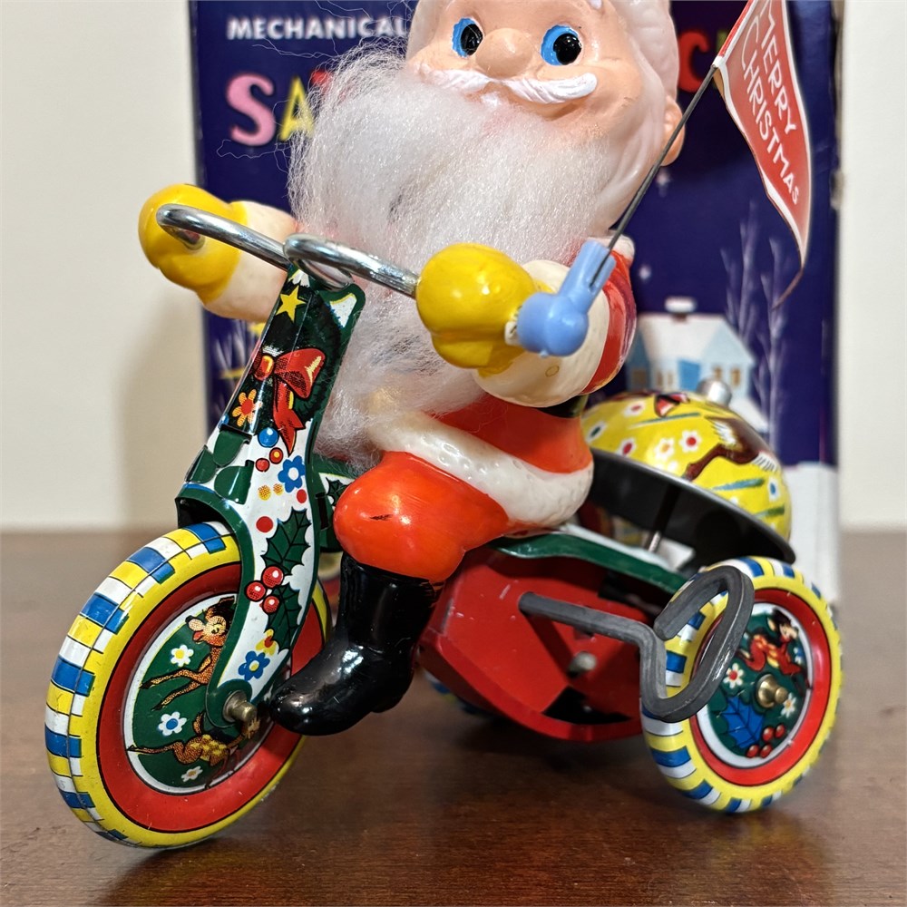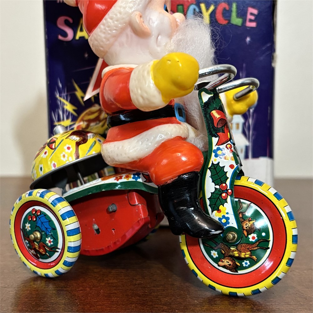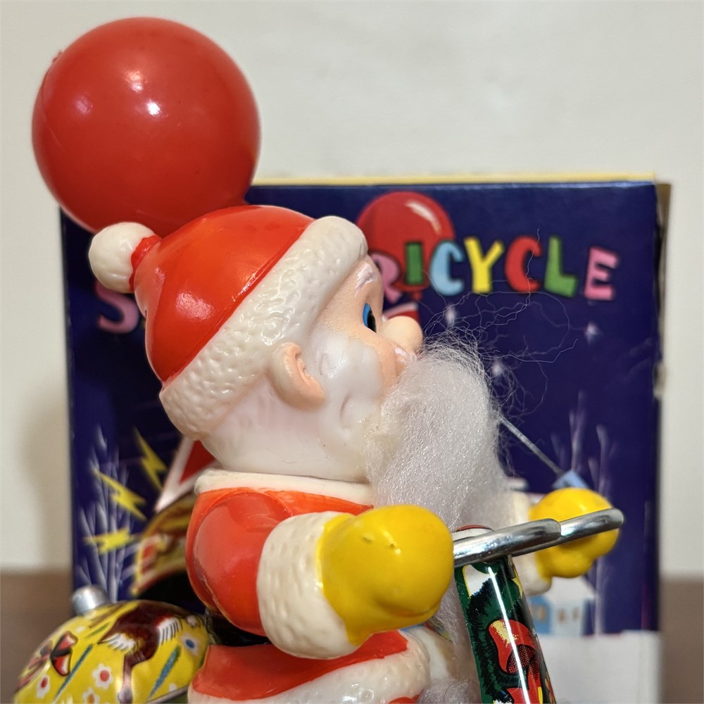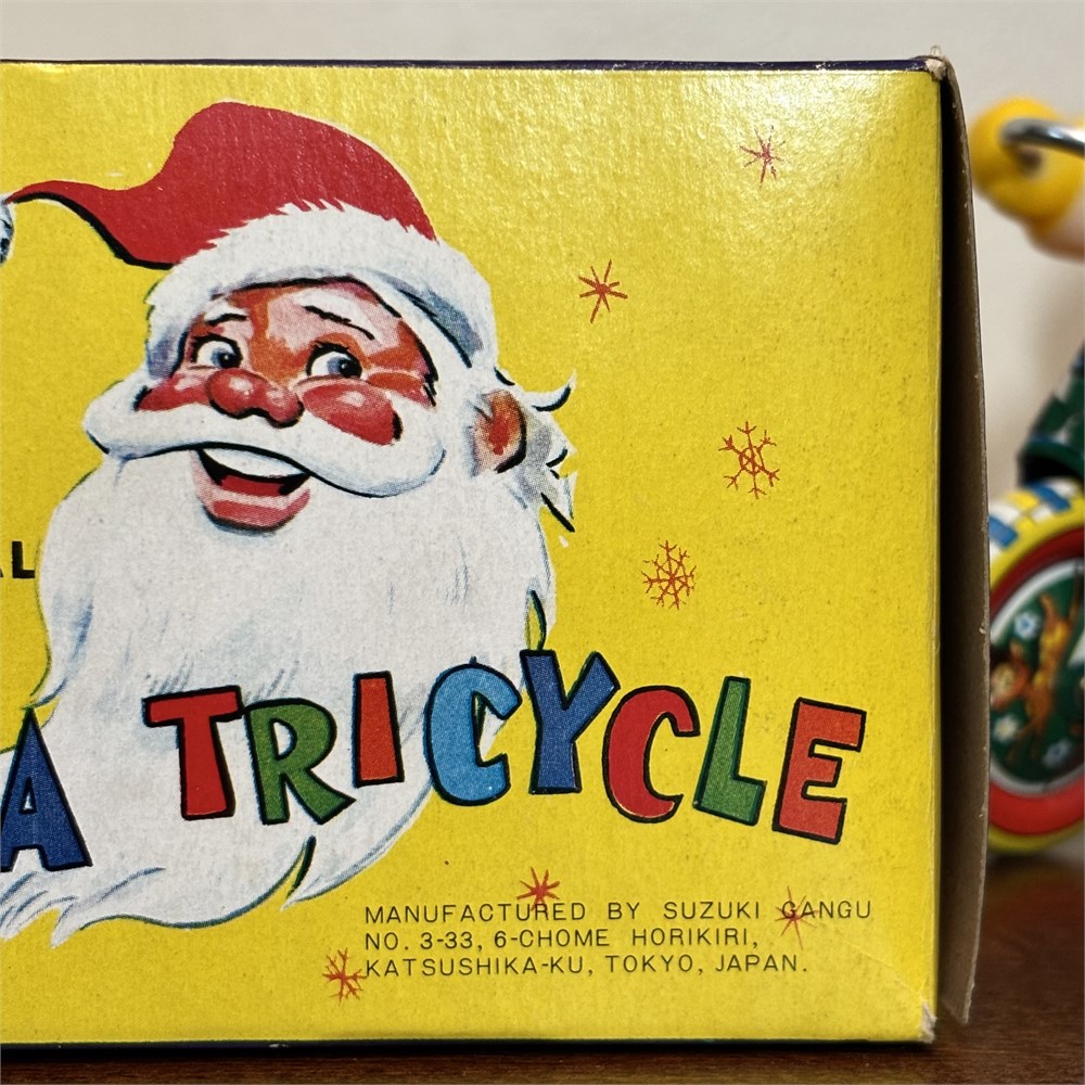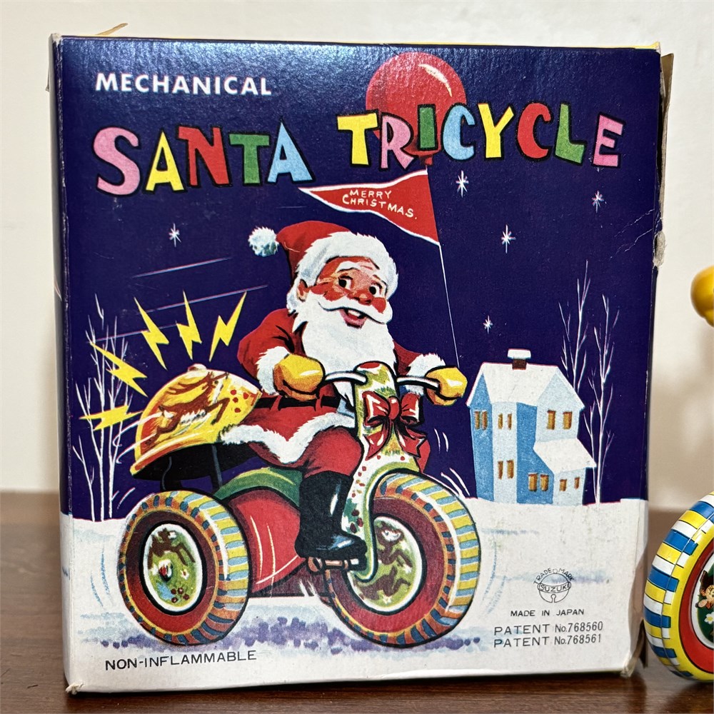 Vintage Tin Litho Santa Tricycle Mechanical Wind-Up Toy w/ Original Box
