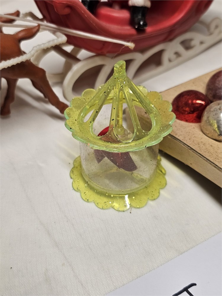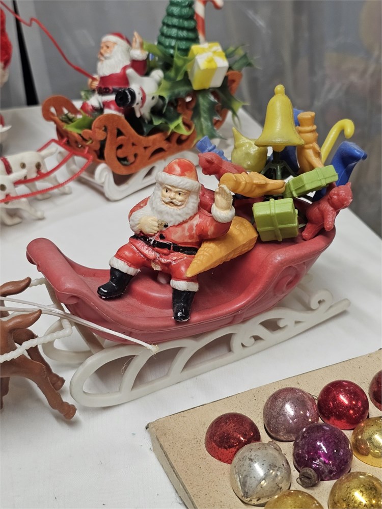 Mixed Vintage Christmas- Battery Op Santa, Plastic Felt Sleigh Santa & Deer, Plastic Santa & Sleigh (Needs Repaired), Yellow Spinner & More