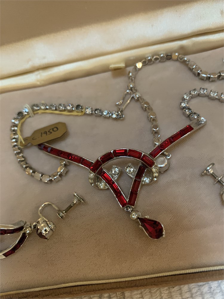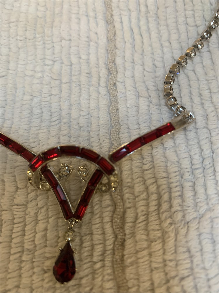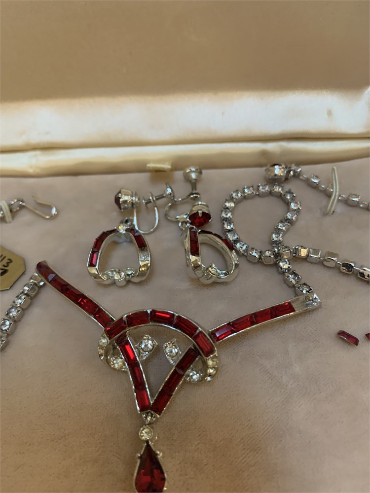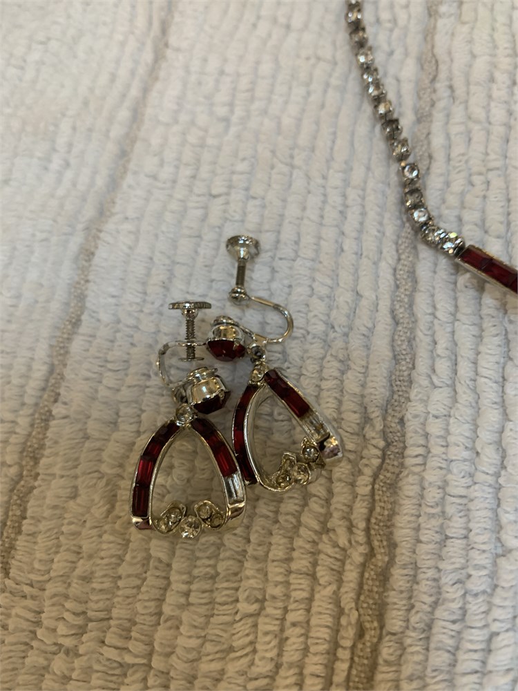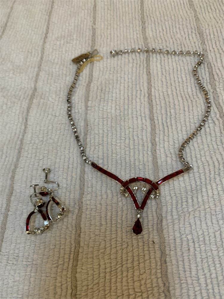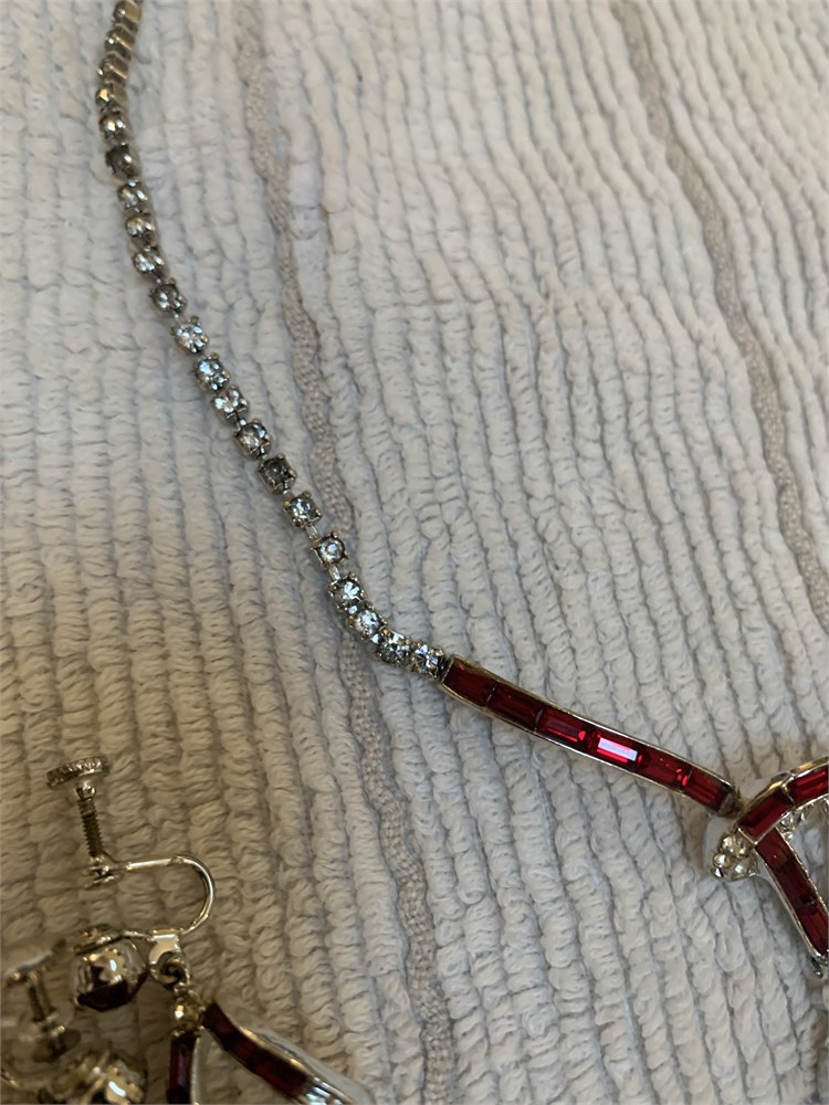 Art Deco Ruby Red & Clear Rhinestone Necklace W/Matching Screw Back Earrings View Watchlist >