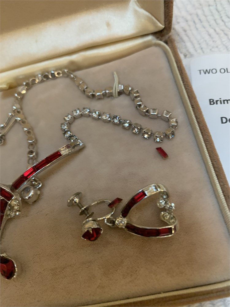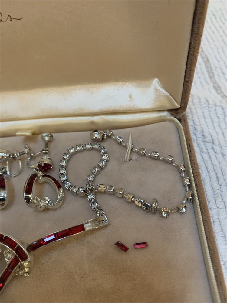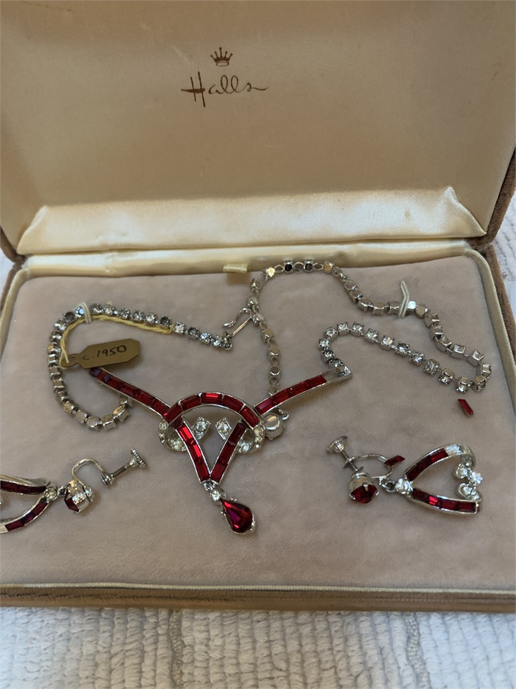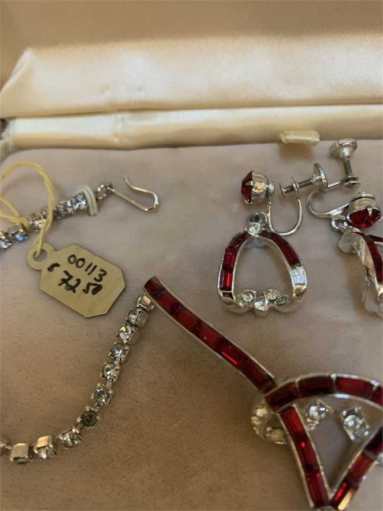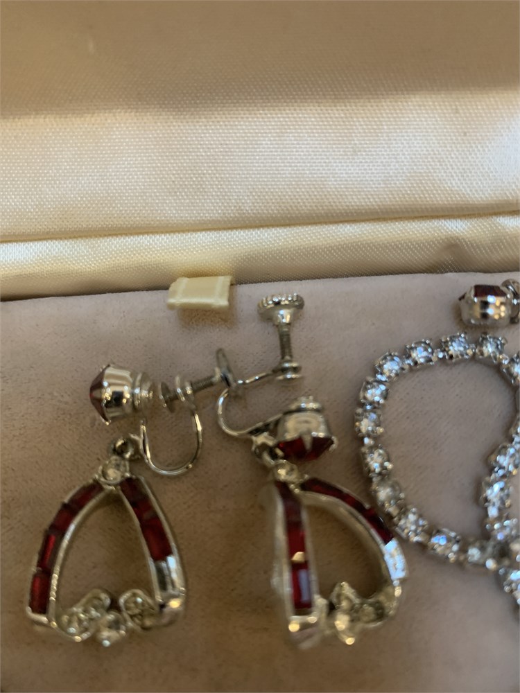 Art Deco Ruby Red & Clear Rhinestone Necklace W/Matching Screw Back Earrings View Watchlist >