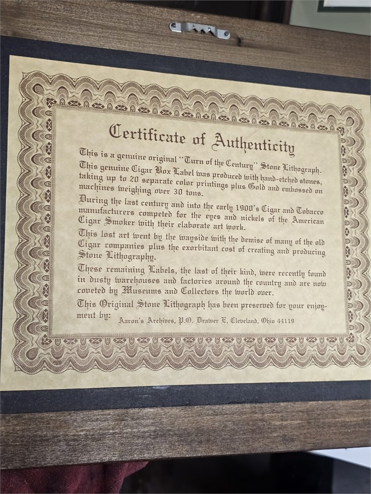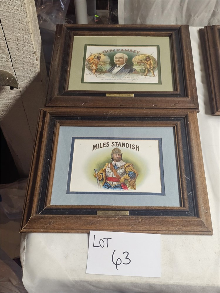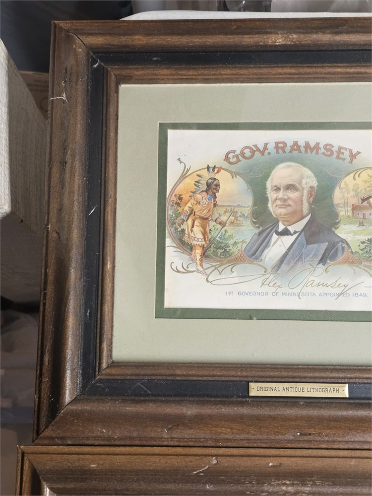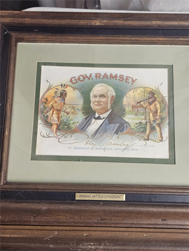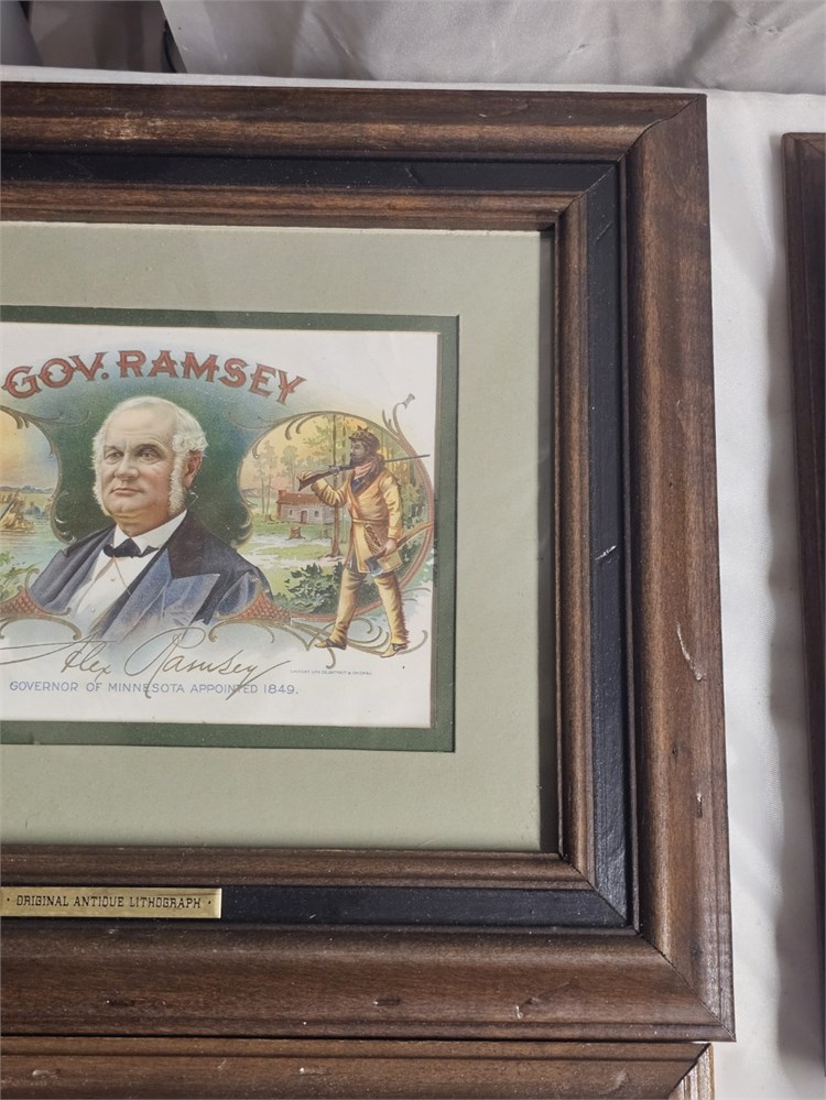 Stone Lithograph Cigar Box Label Framed Gov. Ramsey & Miles Standish