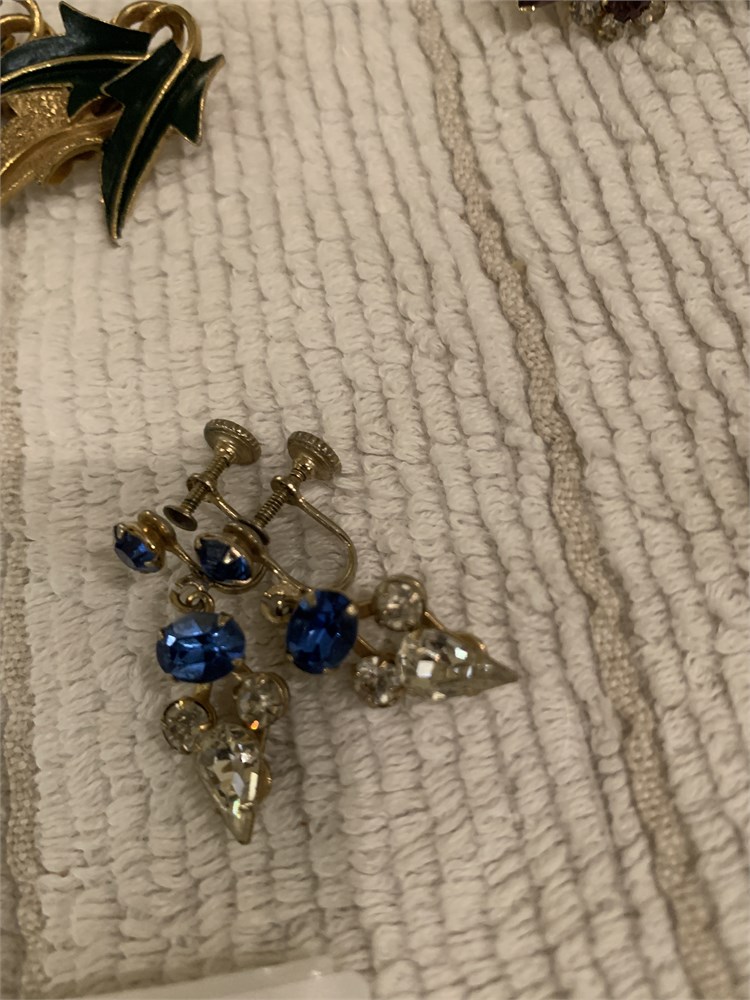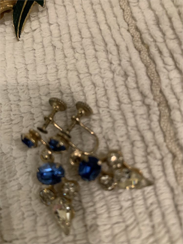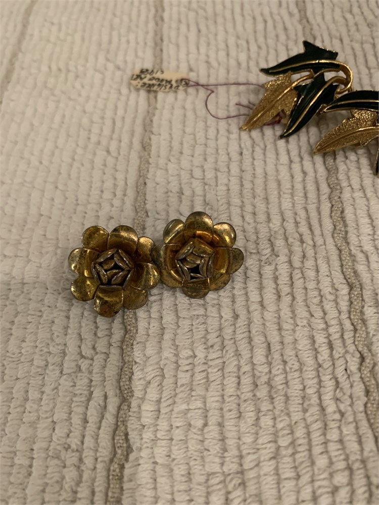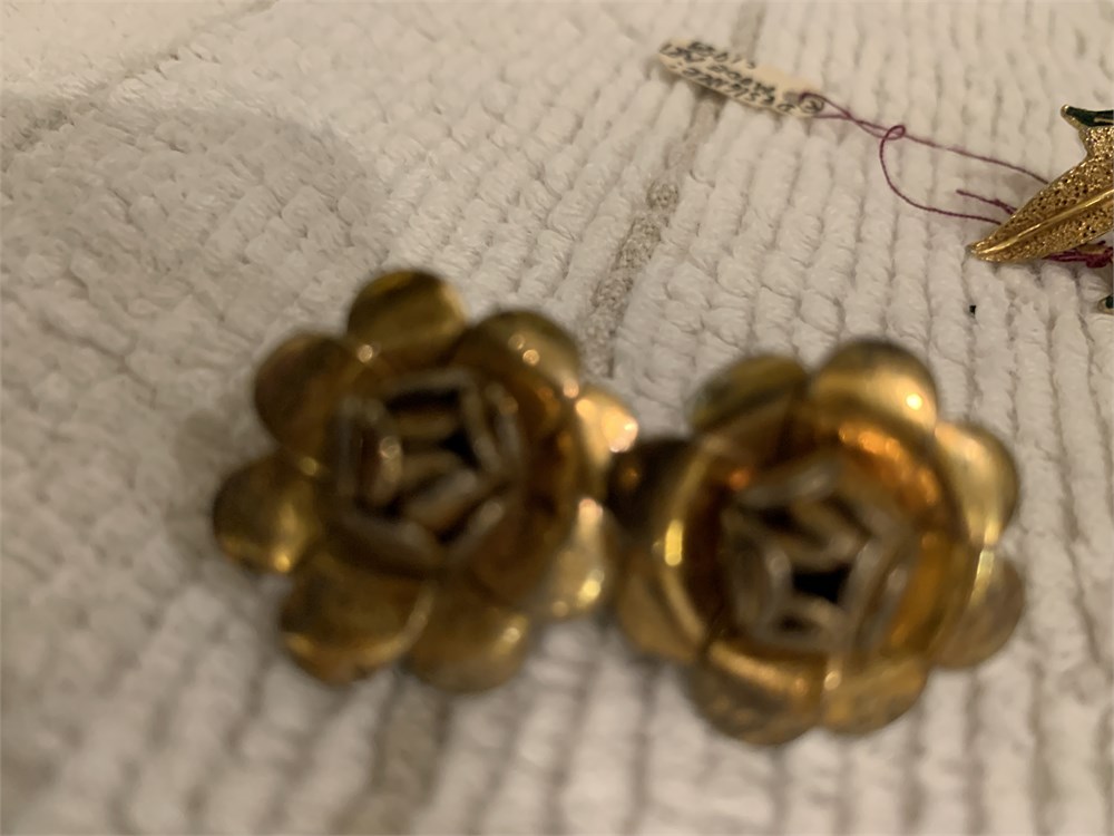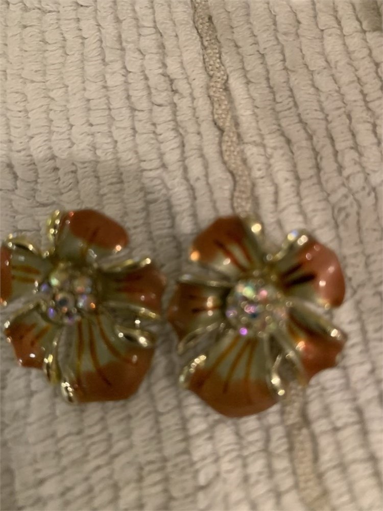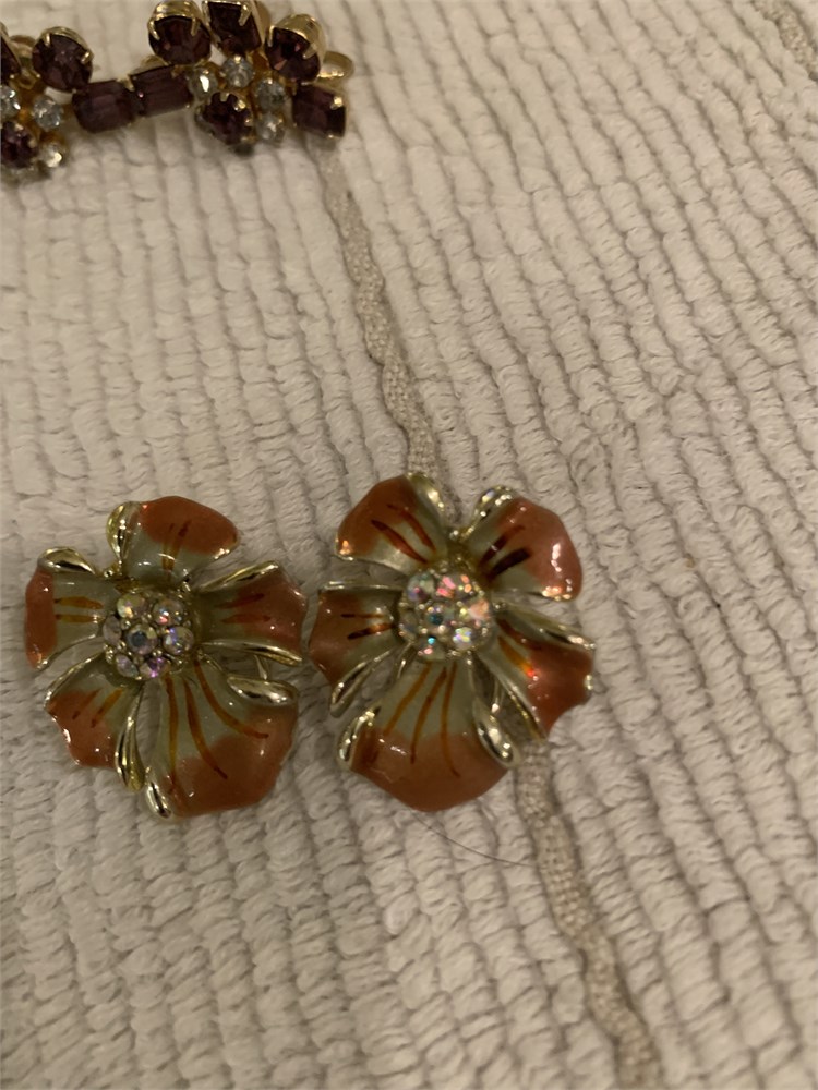 BSK Rhinestone Enameled Clematis Flower Earrings, Brass Rose Clip On Earrings