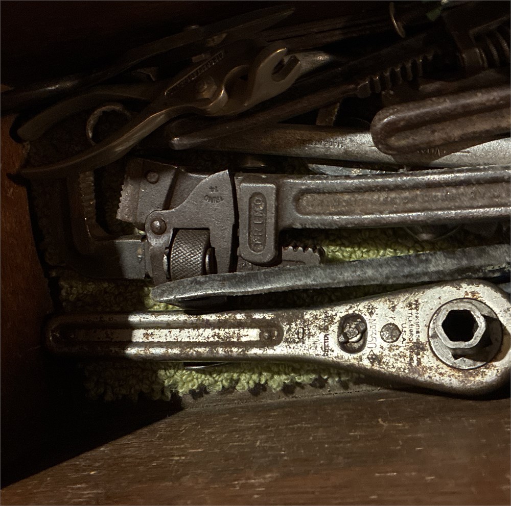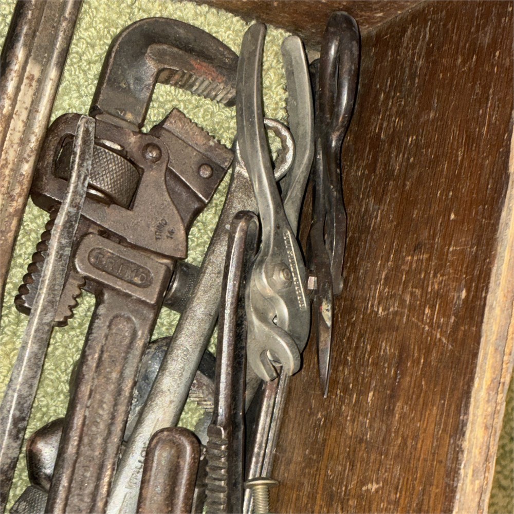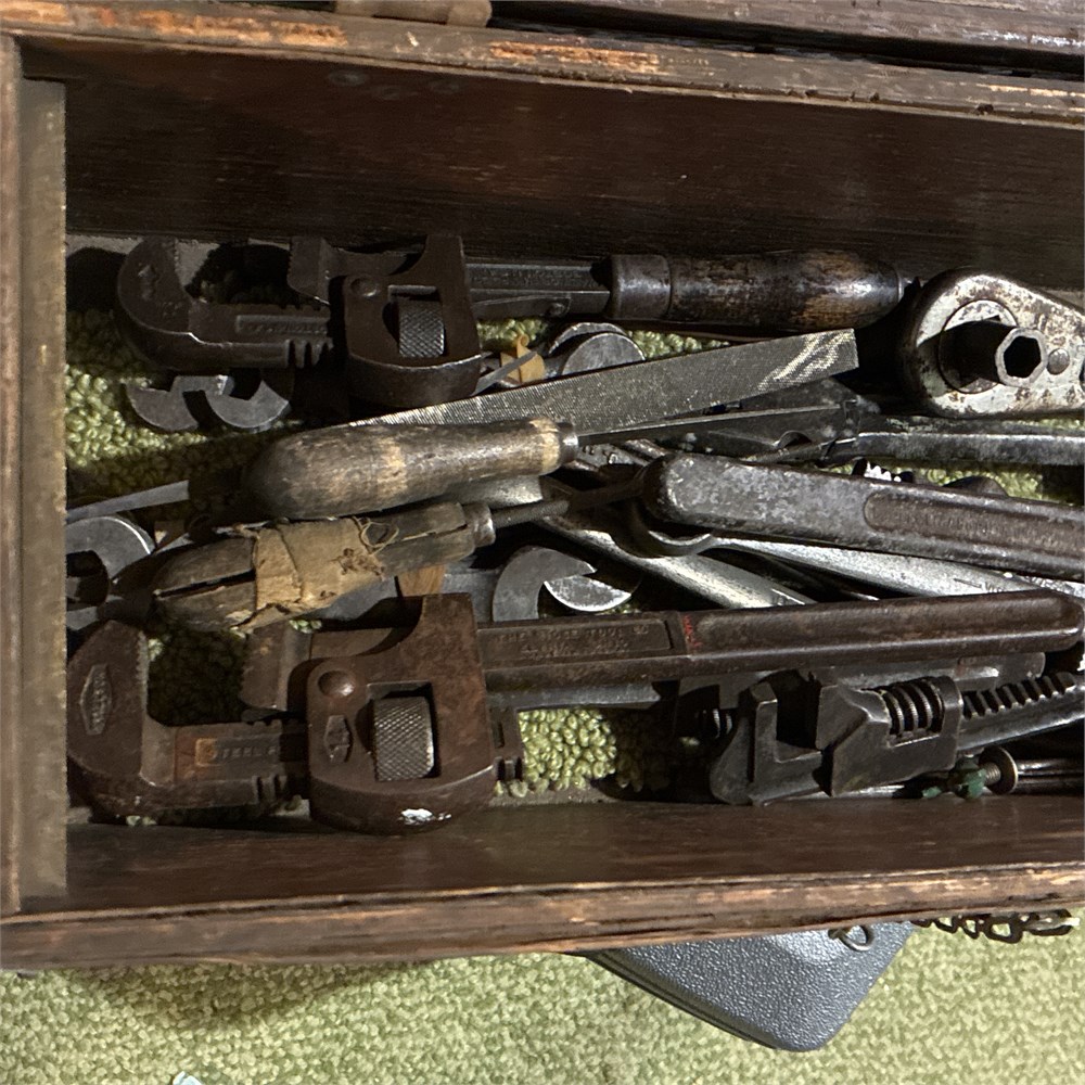 Steel Framed Wooden Toolbox Full of Vintage & Antique Tools View Watchlist >