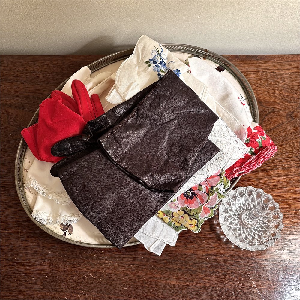 Vintage Embroidered Handkerchiefs and Ladies Items on Large HP Vanity Tray