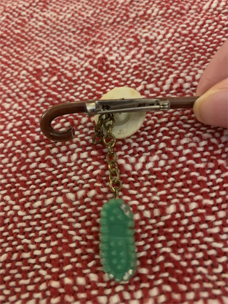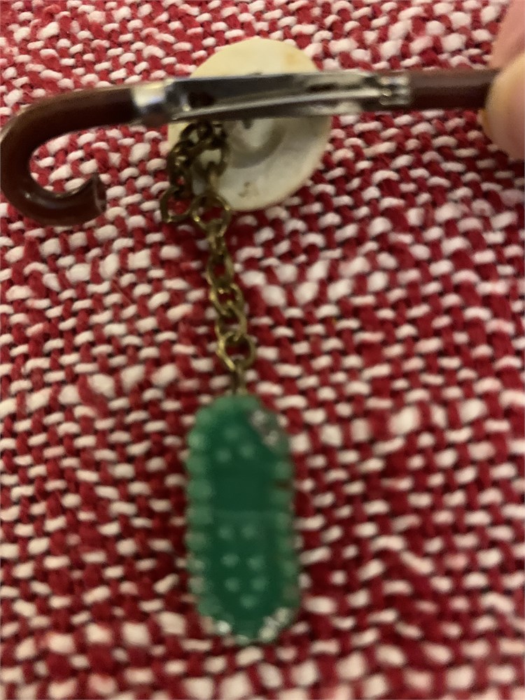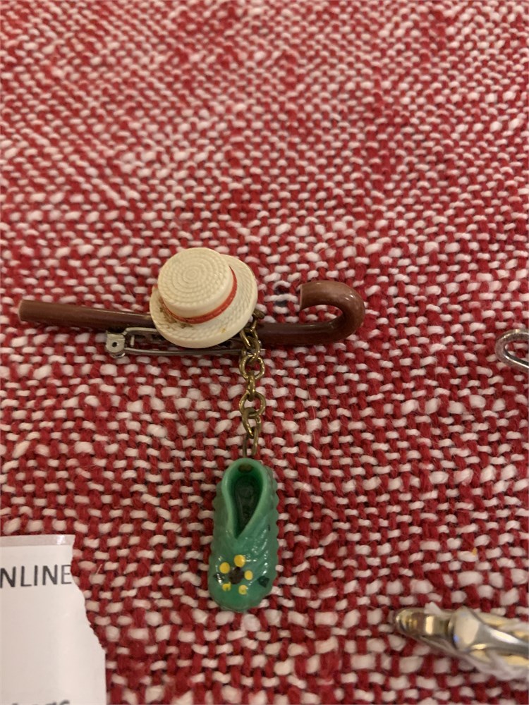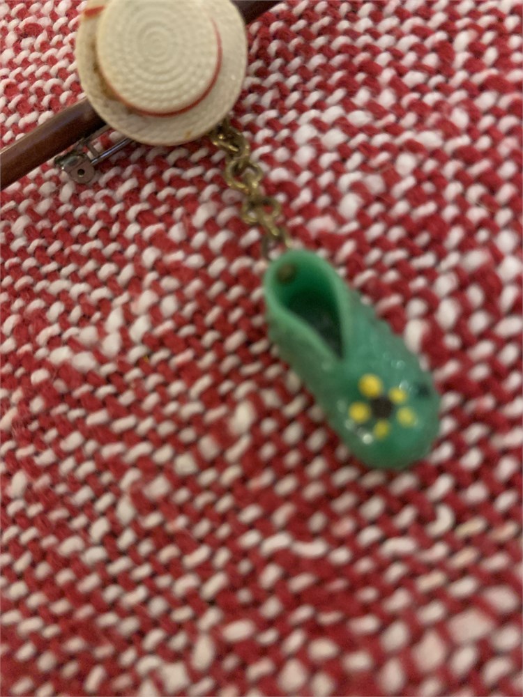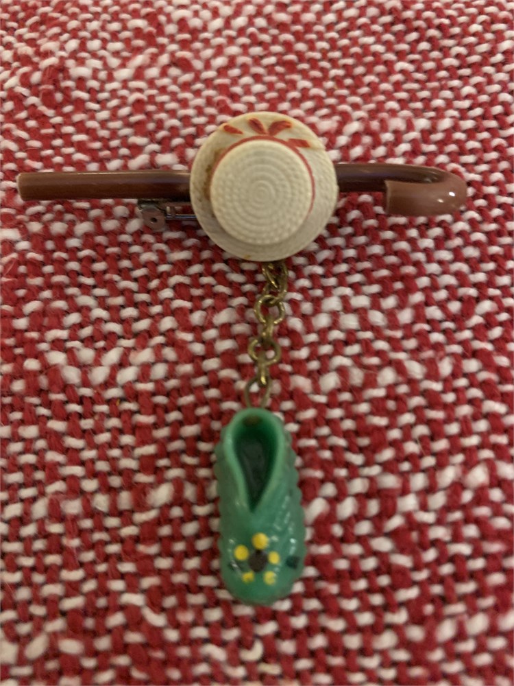 Celluloid Dangling Pin W/Cane, Hat & Green Shoe Charms
