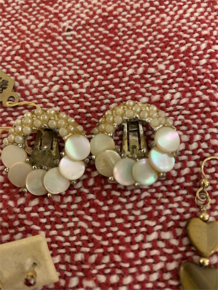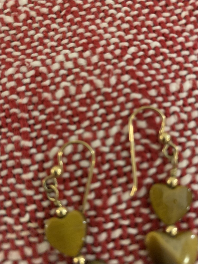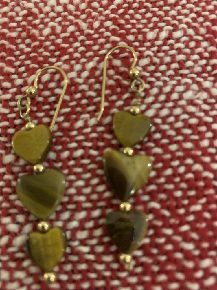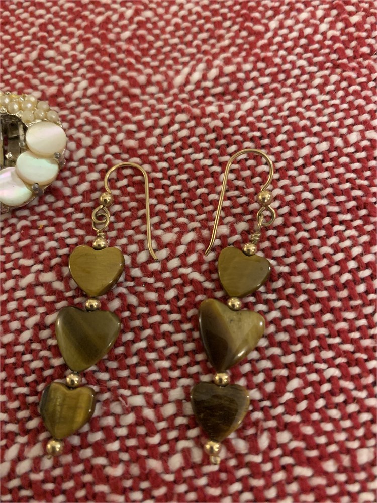 Tiger's Eye Dangling Hearts Earrings, Circle Mother of Pearl Disc Earrings