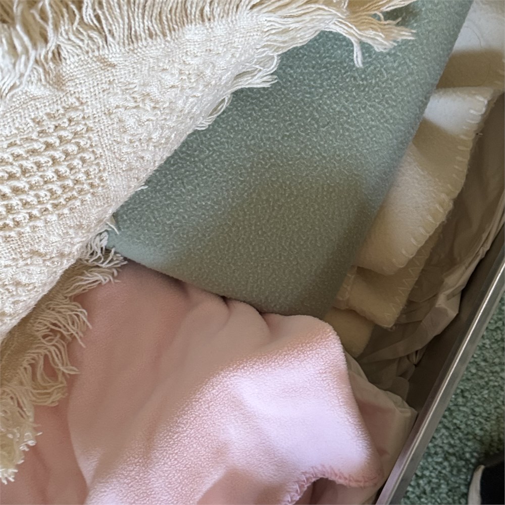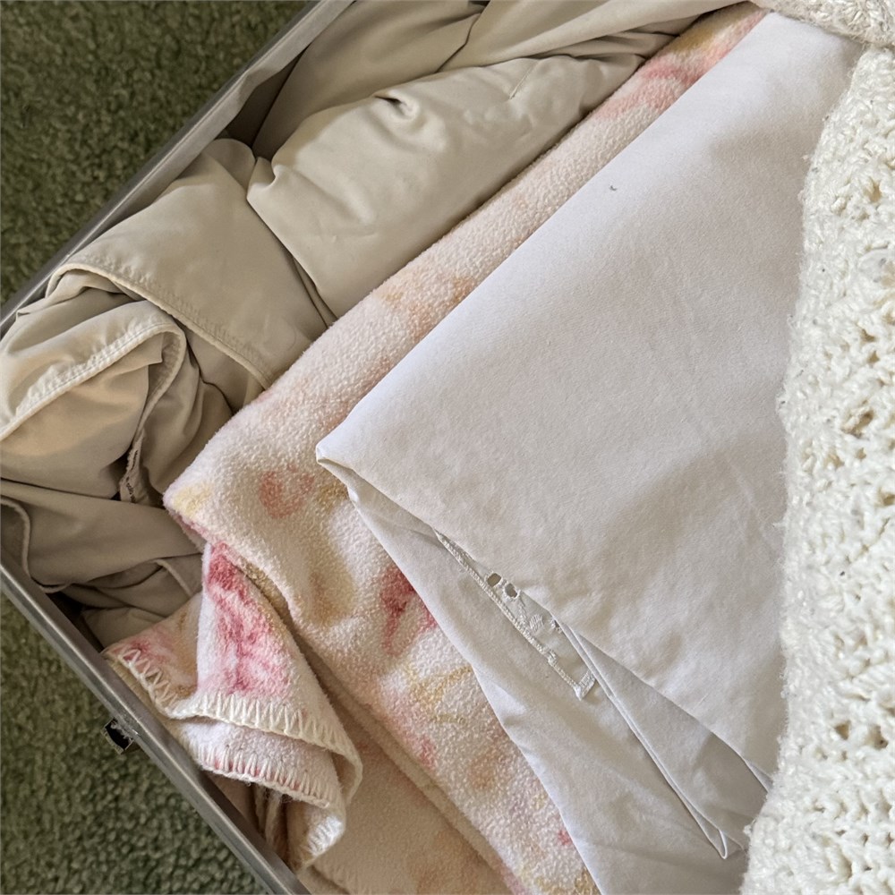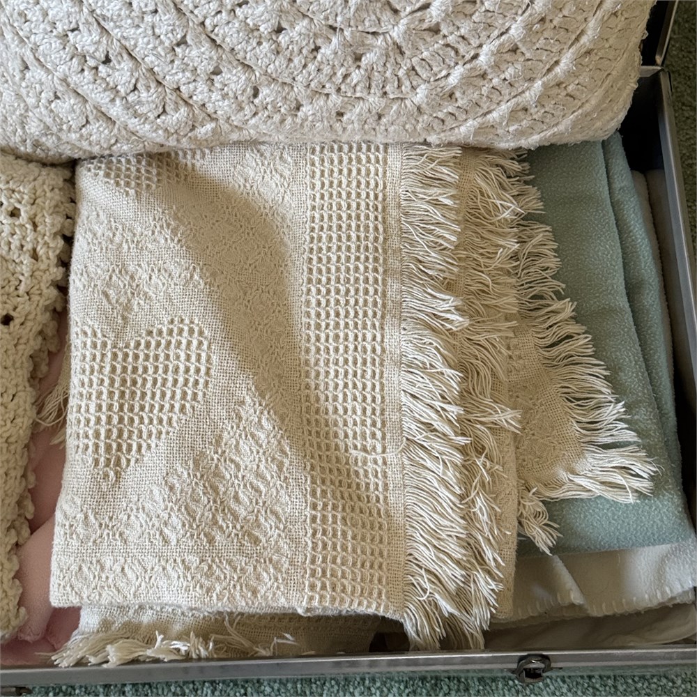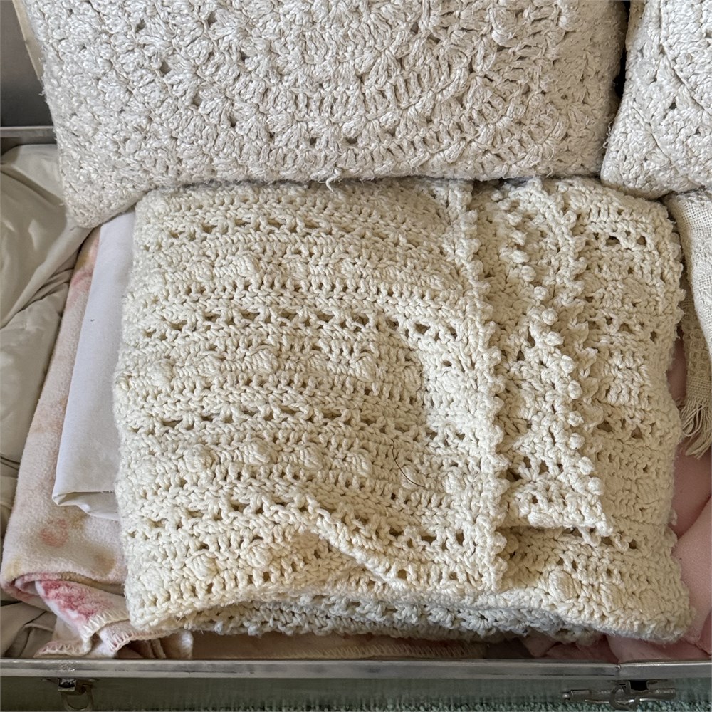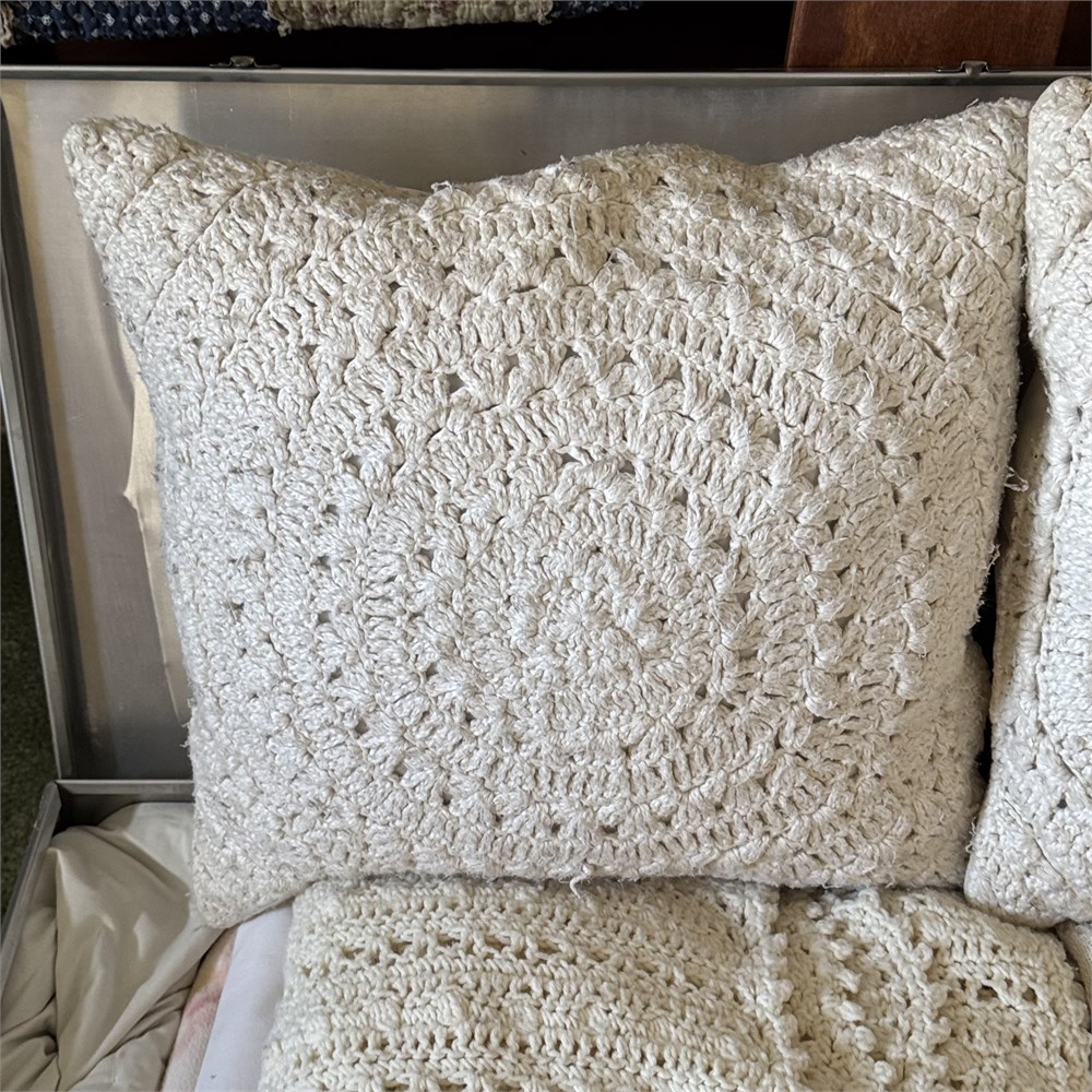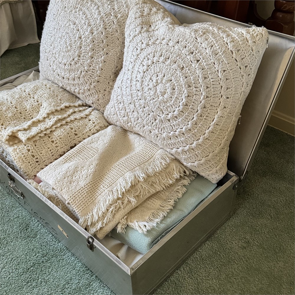 Large Metal Rectangular Storage Box w/ Linens, Blankets, Crocheted Pillows...