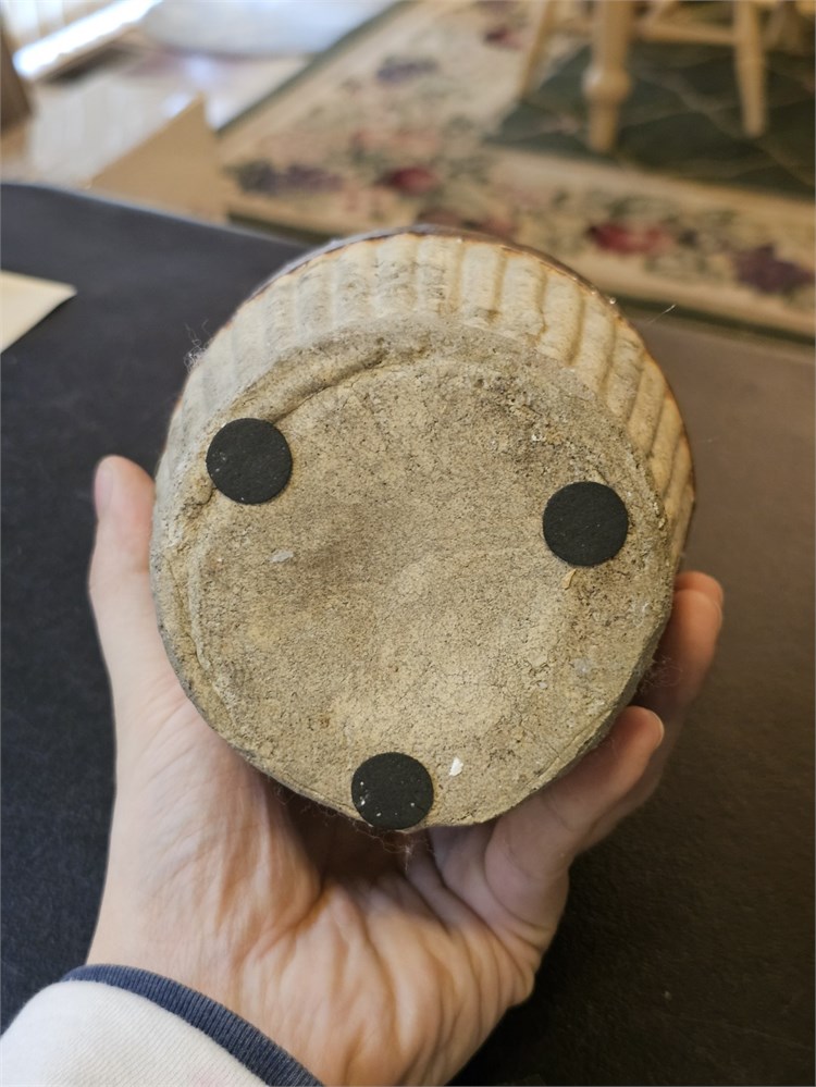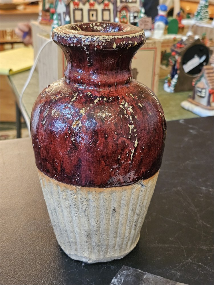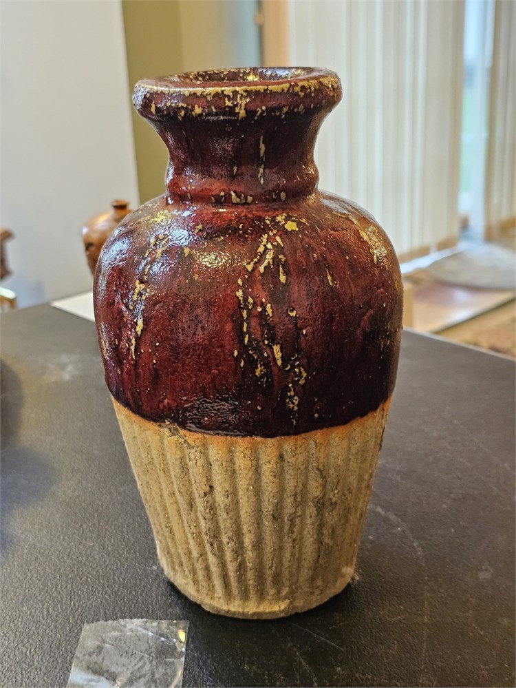 Antique Half Glaze Thick Stoneware Vase Top Features Glossy Deep Oxblood Glaze & Bottom Ribbed Stoneware