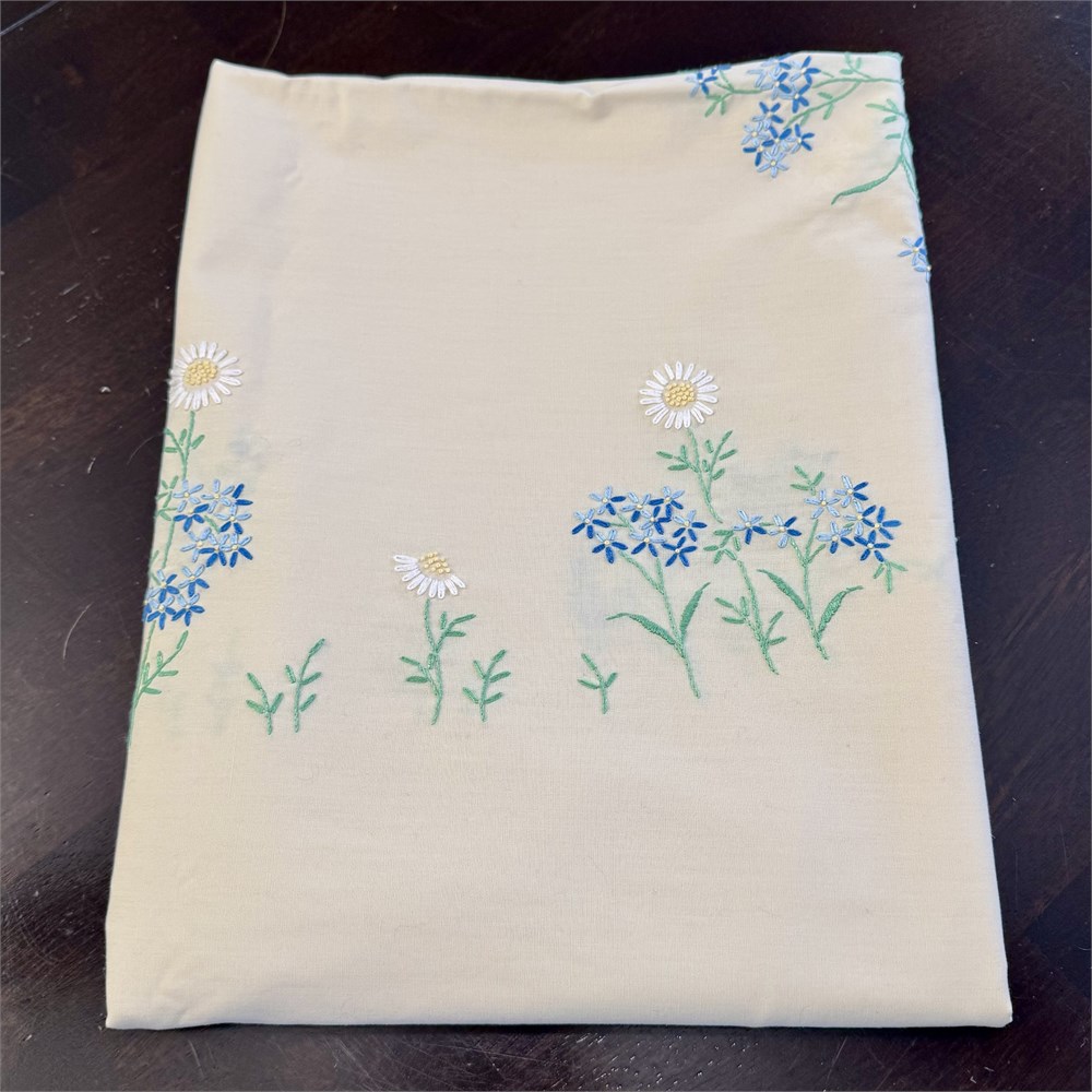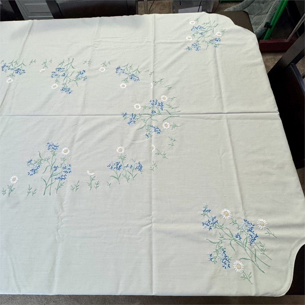 VTG Floral Hand Embroidered Scalloped Edge Tablecloth - 86" x 58"