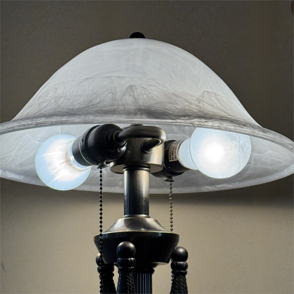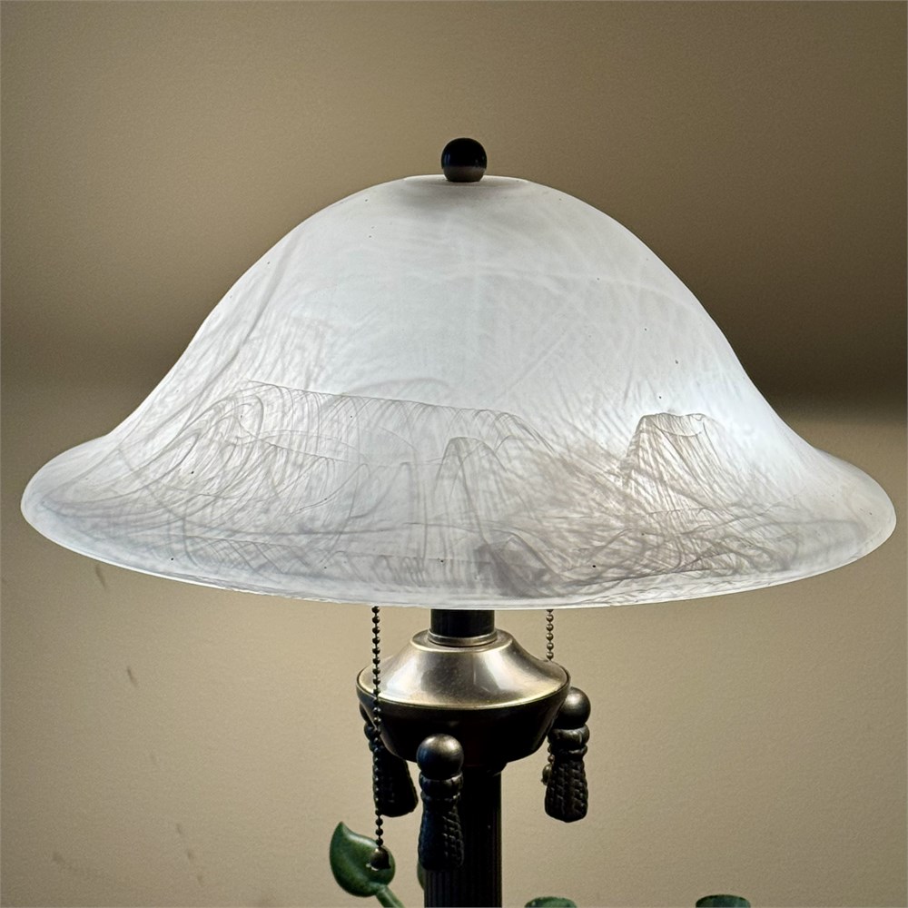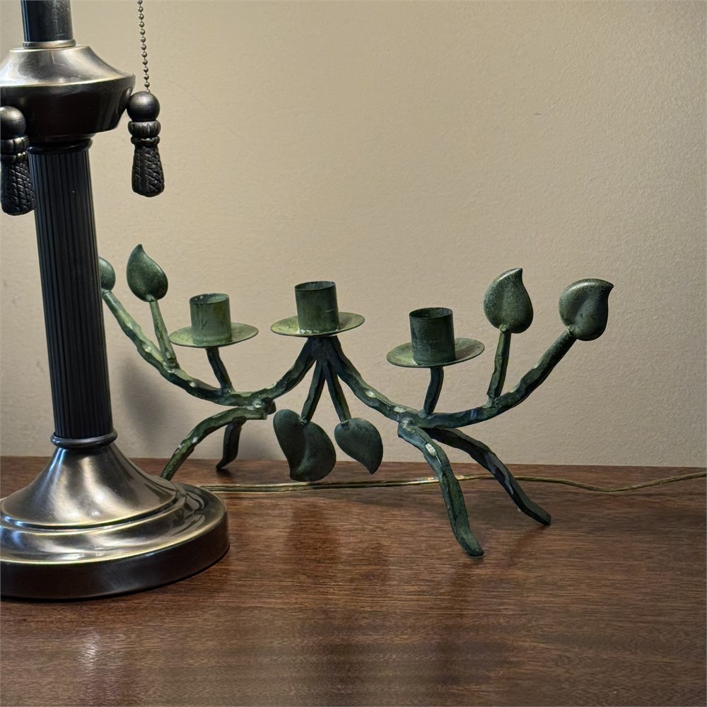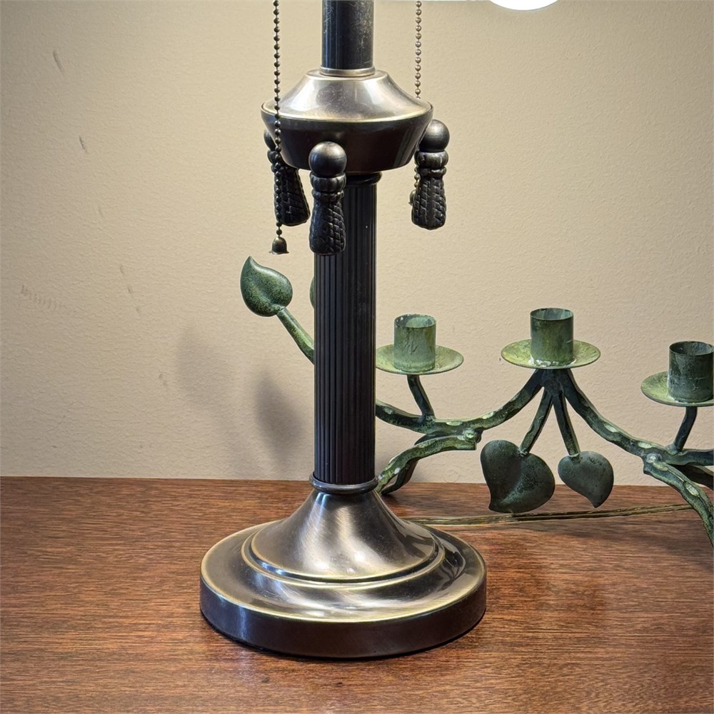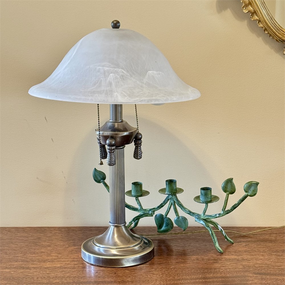 Double Light Satin Glass Shade Table Lamp & Vine Motif Candle Holder