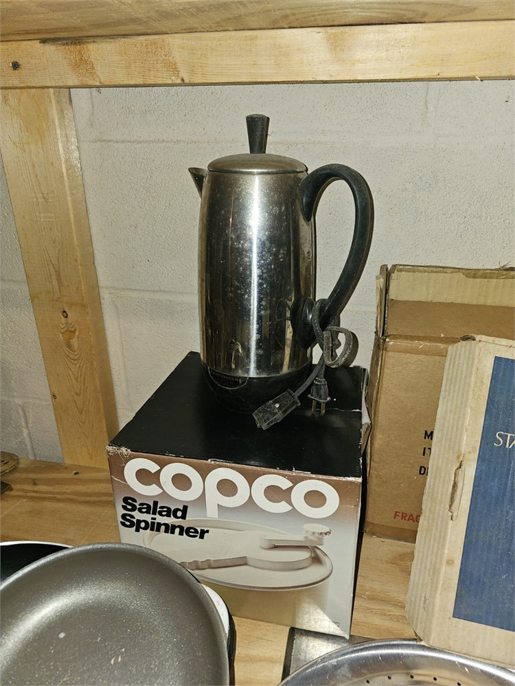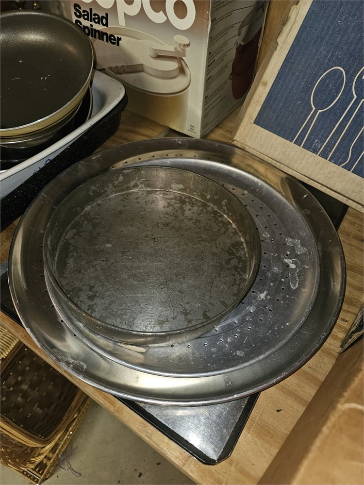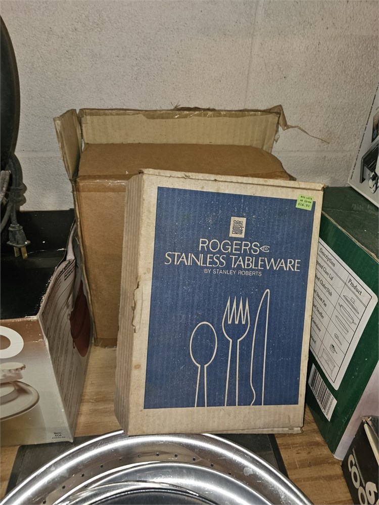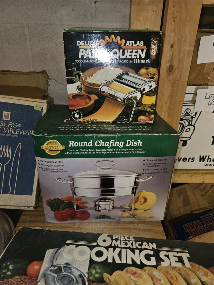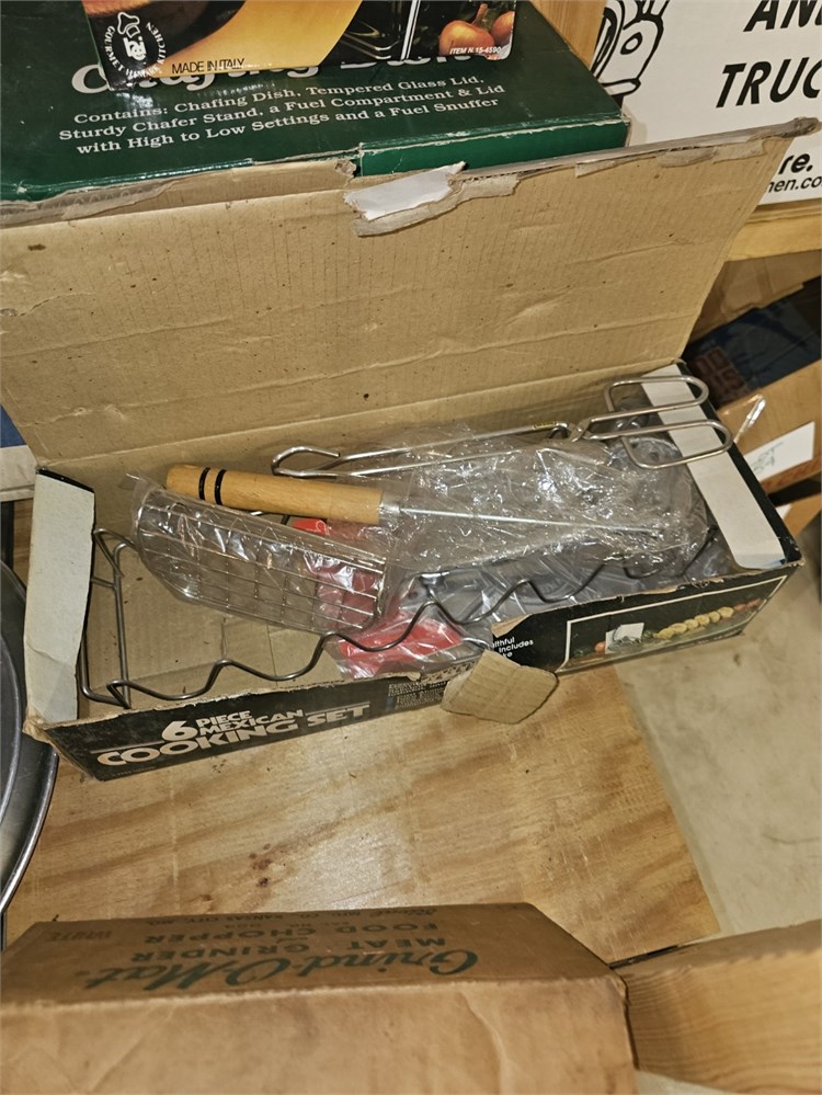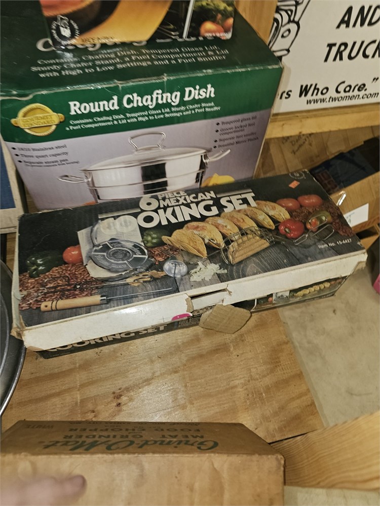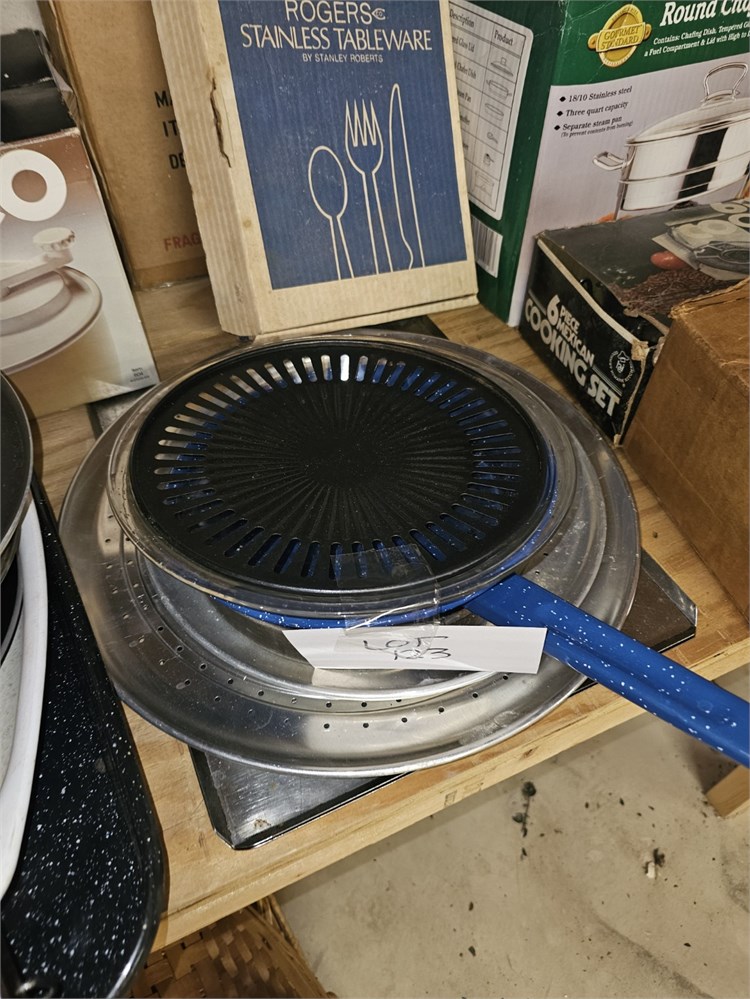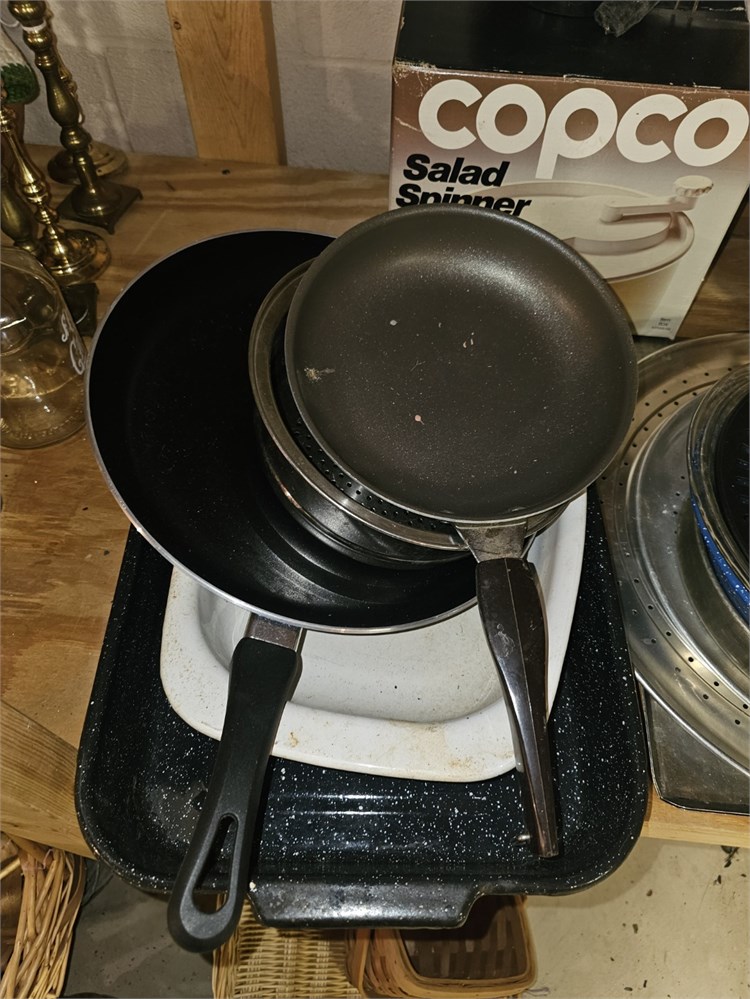 Mixed Kitchen Lot- Fry Pans, Cooking Set, Chafing Dish, Plated Rogers Flatware & View Watchlist >