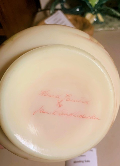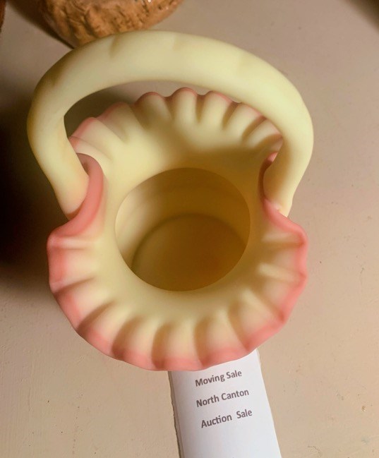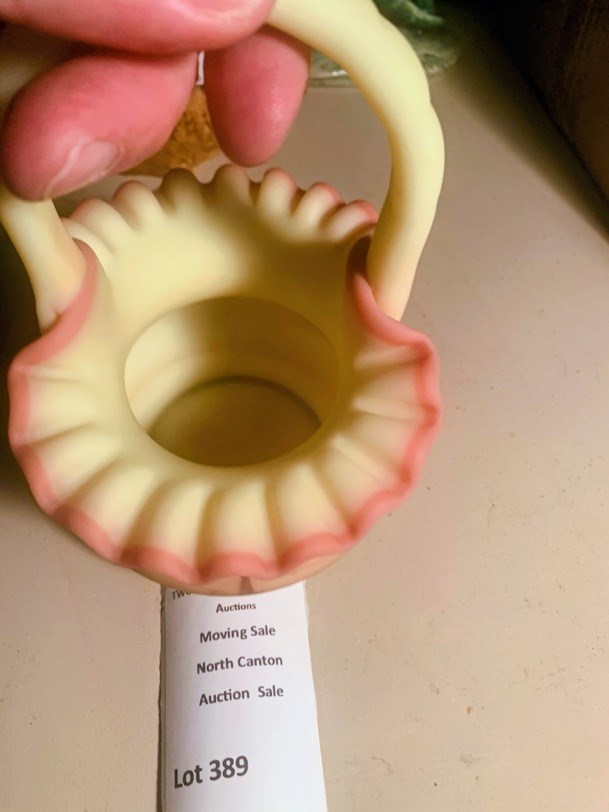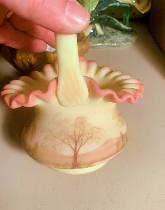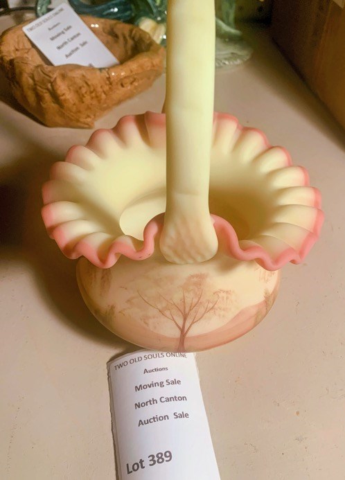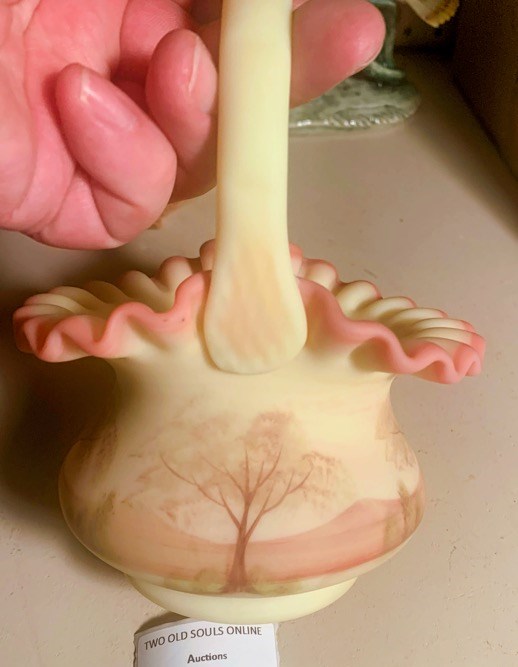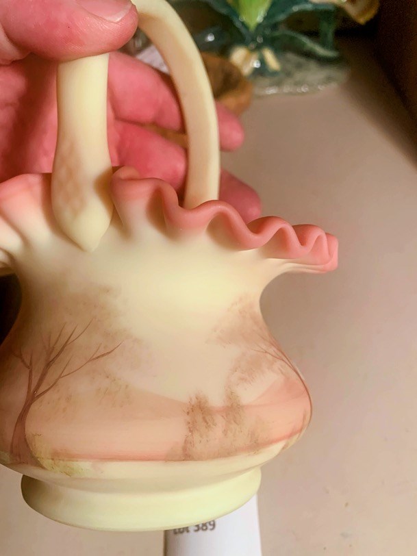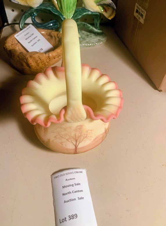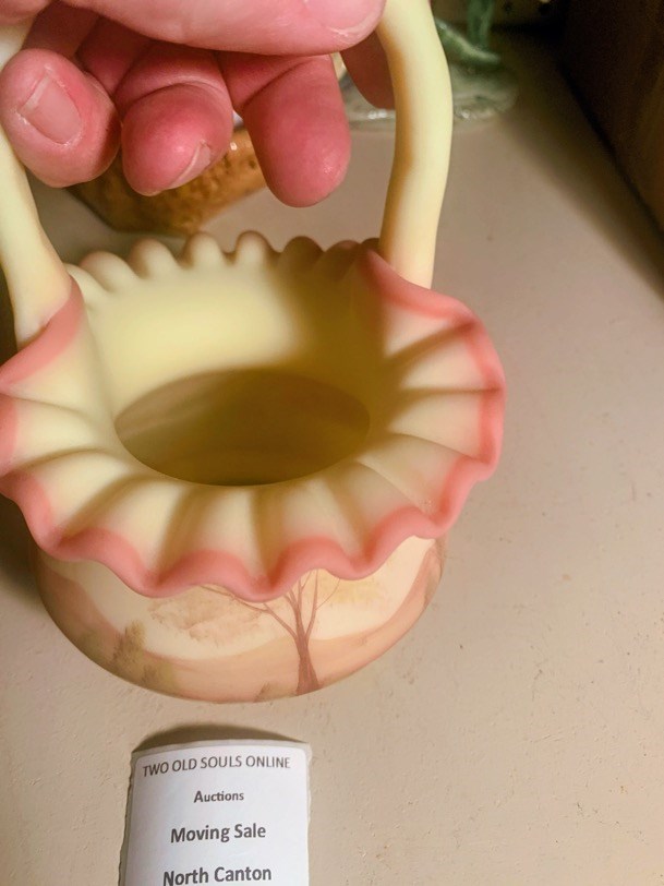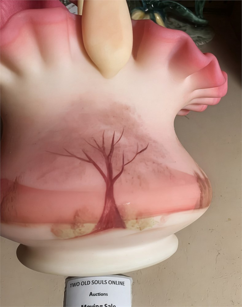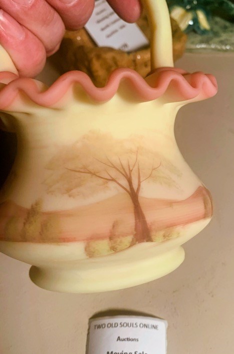 Fenton Burmese Satin Glass Basket W/Peace Crest Ruffled Rim & Painted Tree Scene View Watchlist >