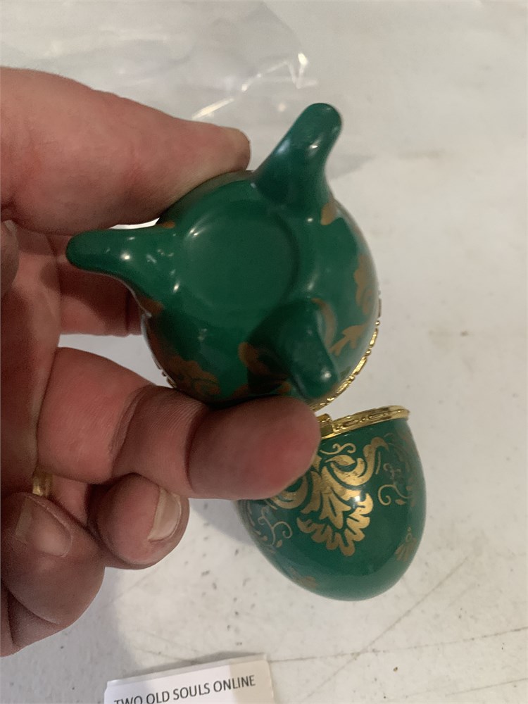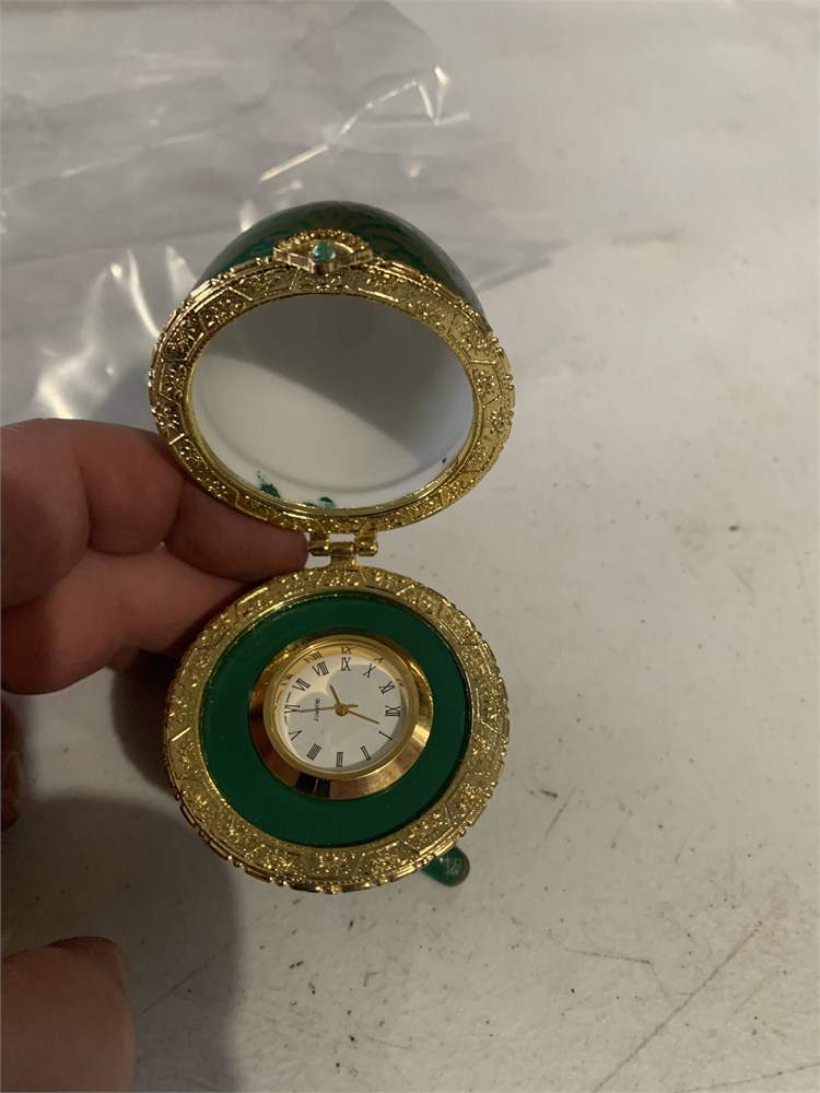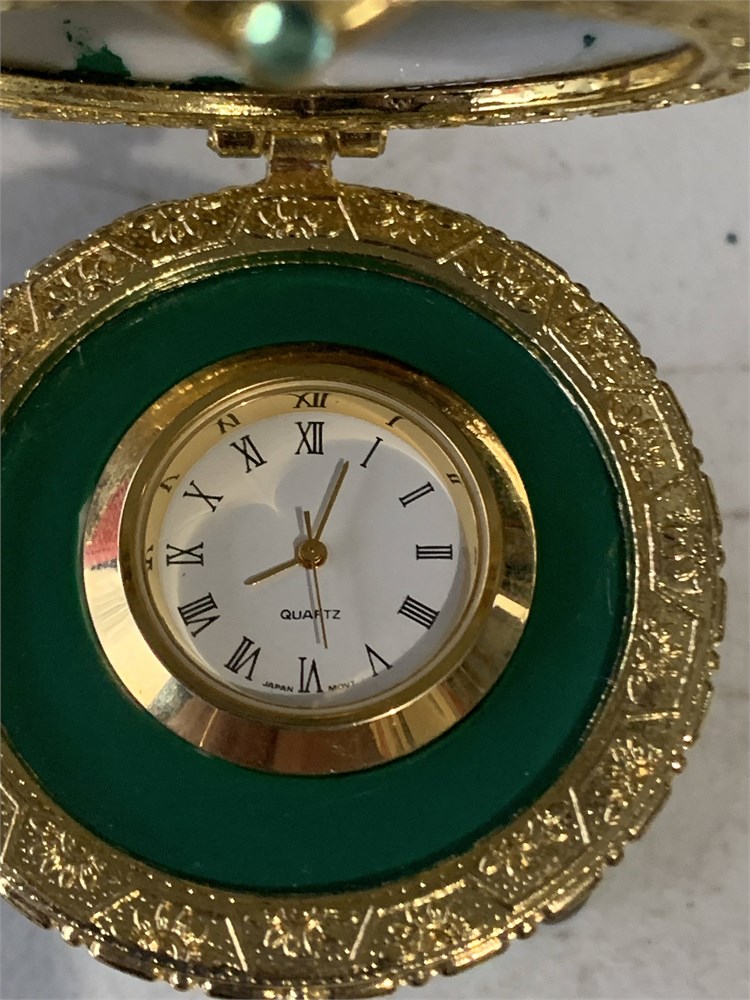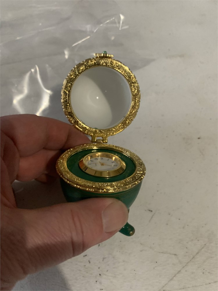 Avon Enamel Faberge-Style Green & Gold Footed Egg W/Hinged Lid & Built In Clock View Watchlist >