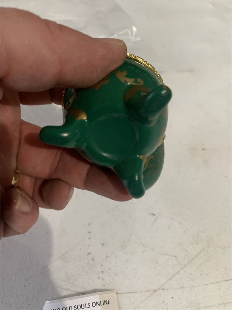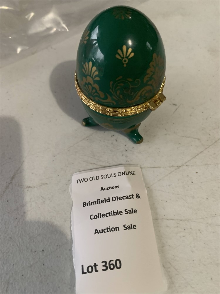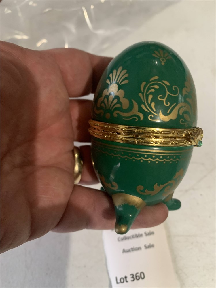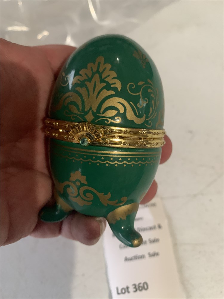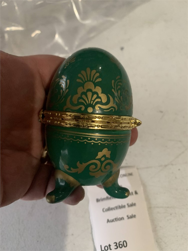 Avon Enamel Faberge-Style Green & Gold Footed Egg W/Hinged Lid & Built In Clock View Watchlist >