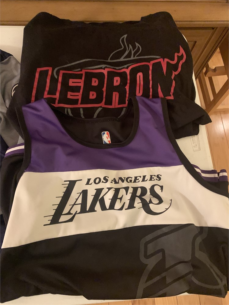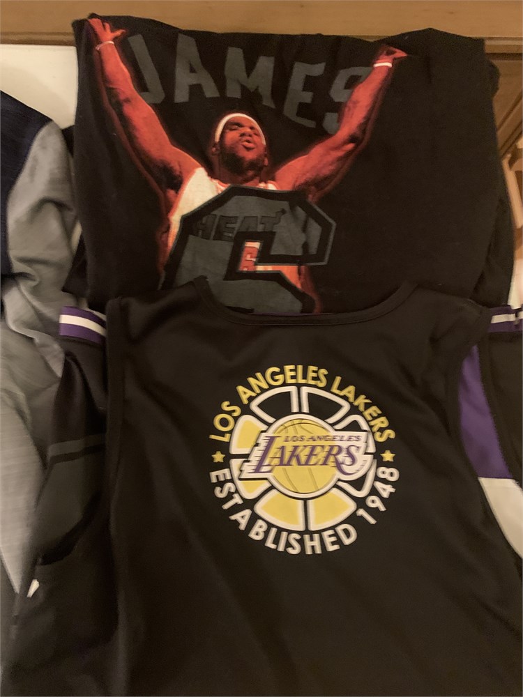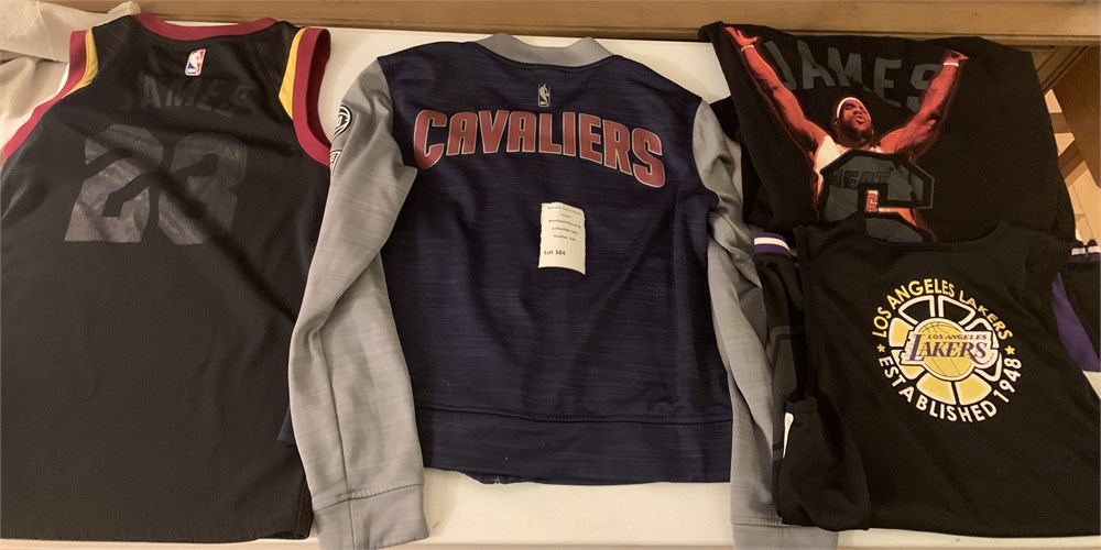 All boys' sizes. Cleveland Cavs jersey (size M), Zip up (size S), Miami Heat T-Shirt (size L), Lakers Jersey (size youth XL)