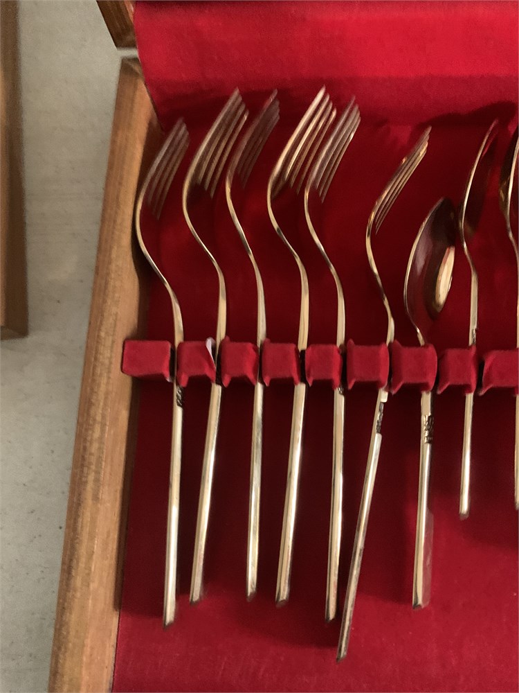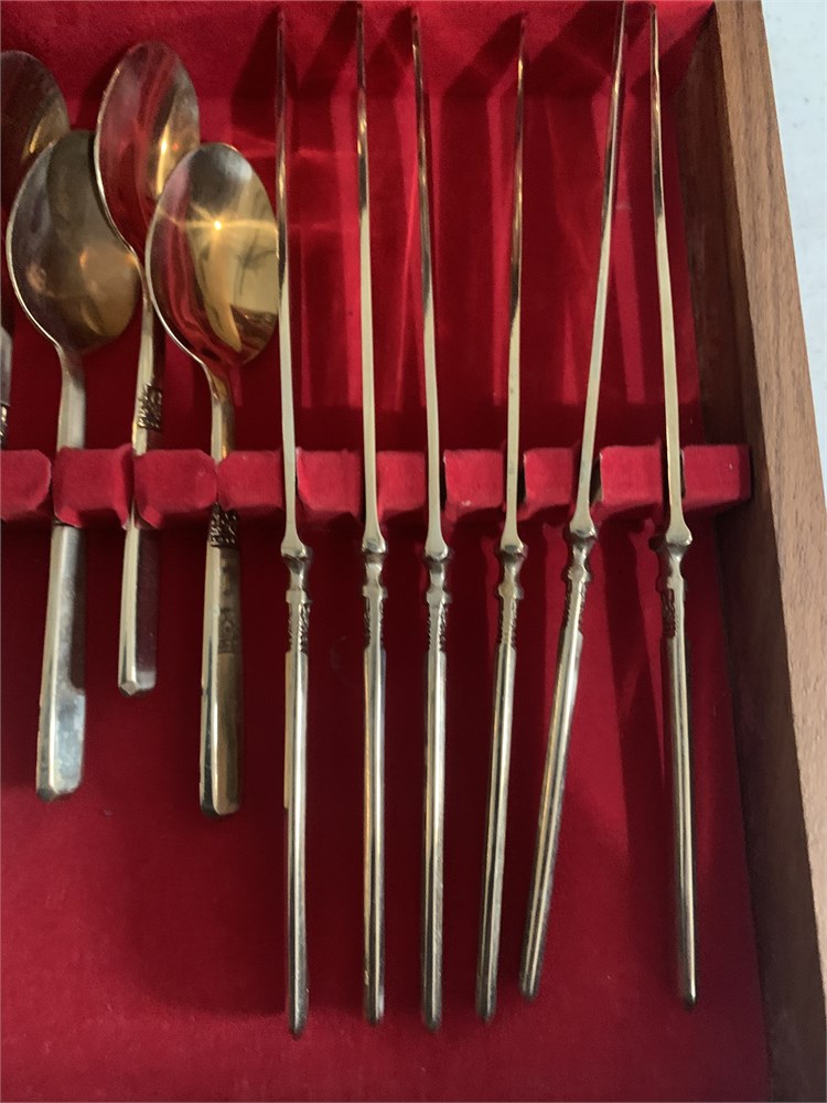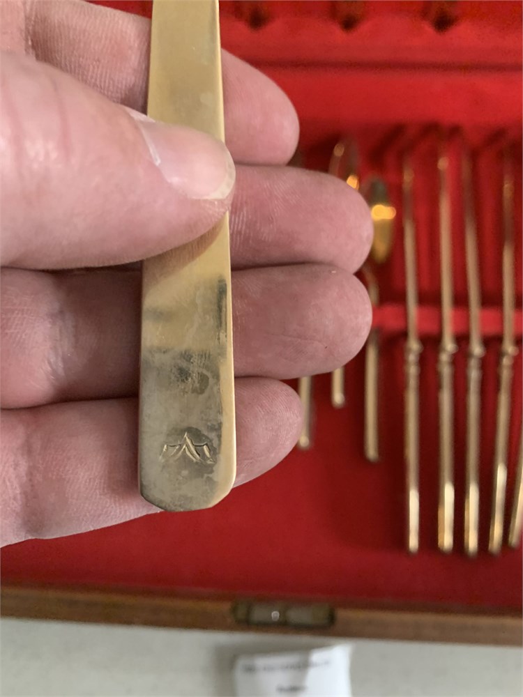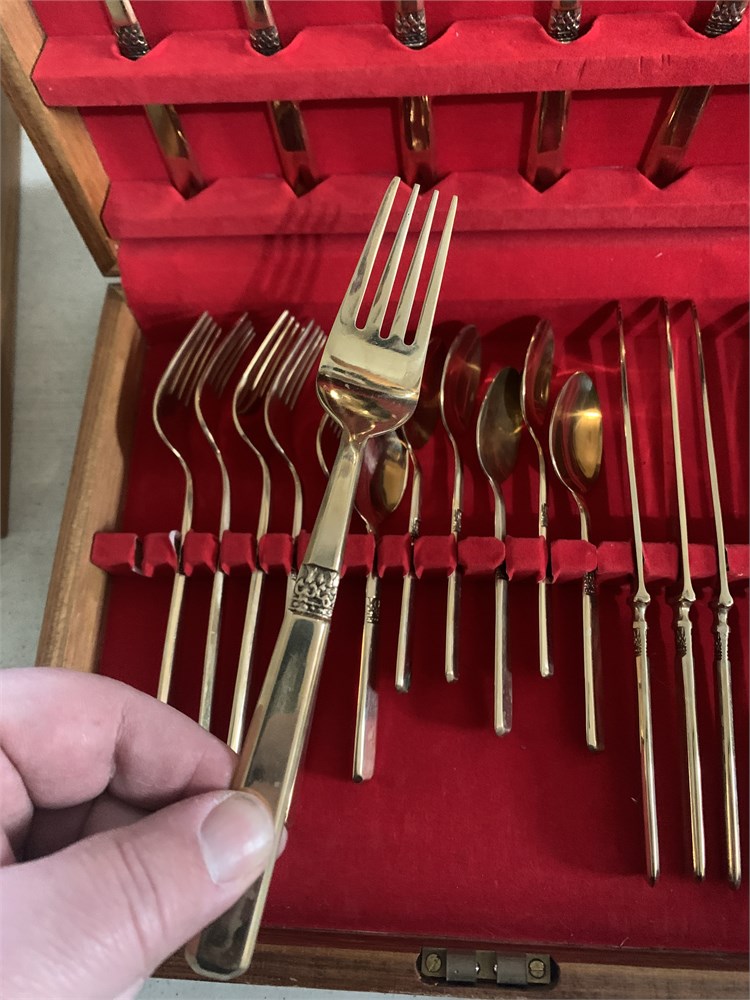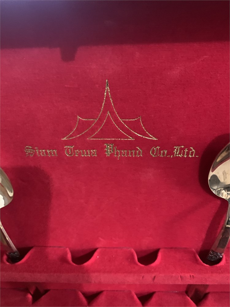 Thai Brass & Bronze Flatware Set W/Faux Bamboo Handles In Wooden Storage Canteen View Watchlist >